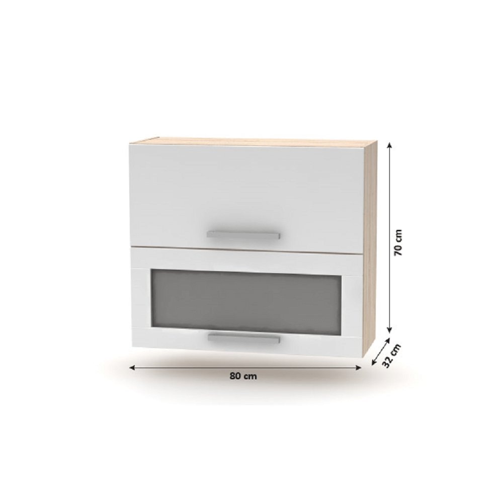 Horní výklopná skříňka se sklem 2DV, NOPL-016-VH Materiál: DTD laminovaná Barva: dub sonoma / bílá Rozměry (ŠxHxV): 80x32x70 cm Tloušťka materiálu: 16 mm Kvalitní slovenský výrobek. Dodávané v demontu. Cena za pracovní desku je 1.550, - Kč za bm - tloušťka 38 mm. Horní rozměr kuchyňské sestavy je 2…