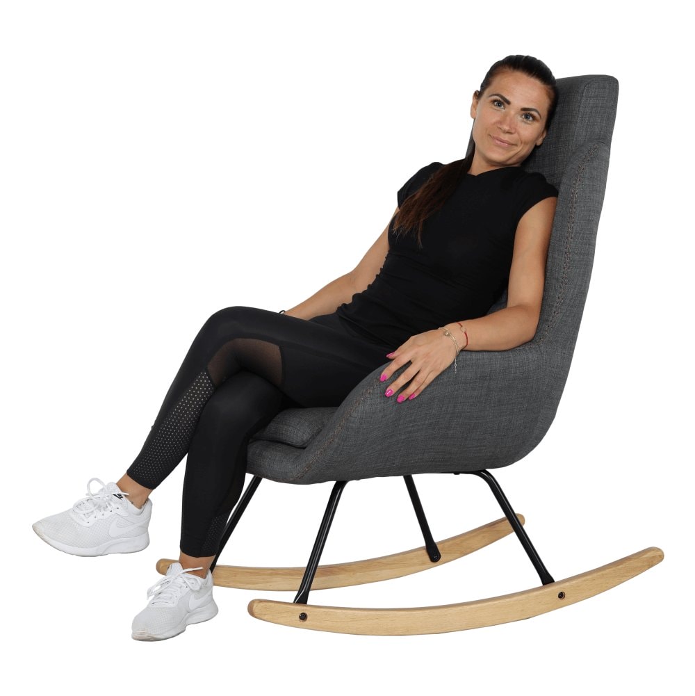 Houpací a relaxační křeslo HARPER materiál: látka / dřevo / kov Oděruodolnost textilie podle testu Martindale: 90 000 oděrek barva: šedá / přírodní / černá Rozměry (ŠxHxV): 75x83x110 cm Výška sedu: 50 cm Hloubka sedu: 56 cm Šířka sedu: 45 cm Výška opěradla: 70 cm Nosnost: 120 kg