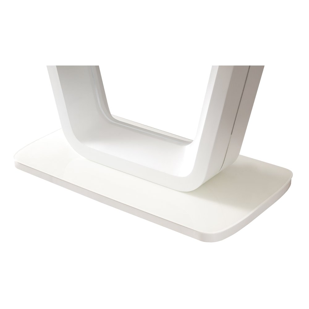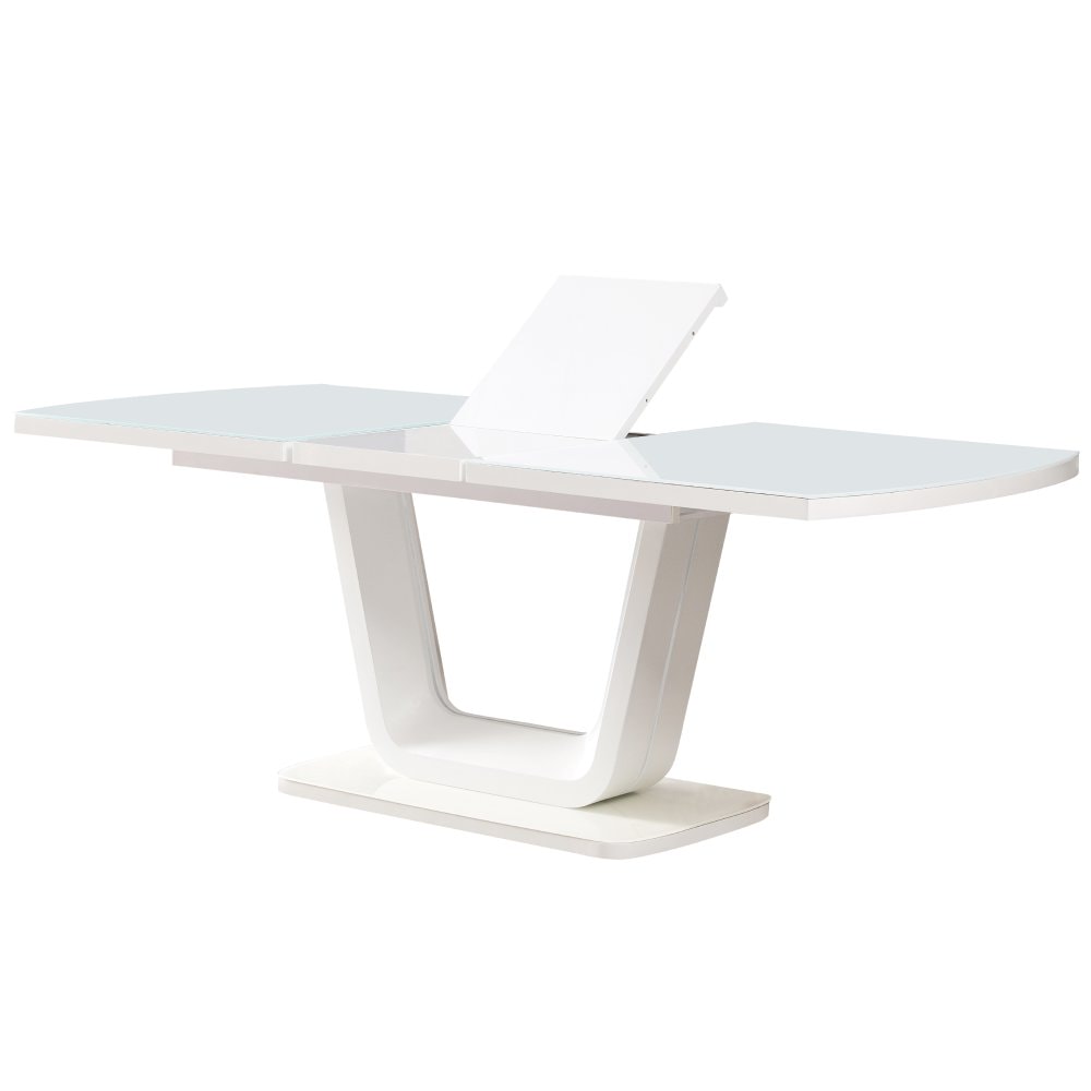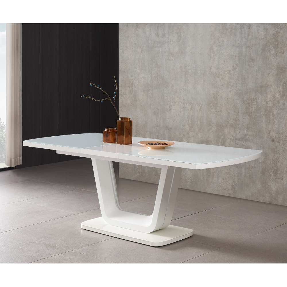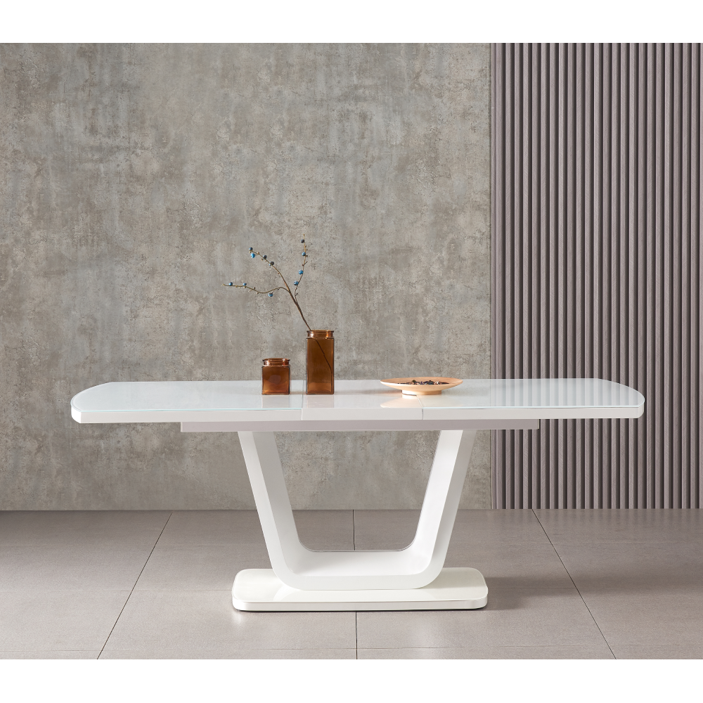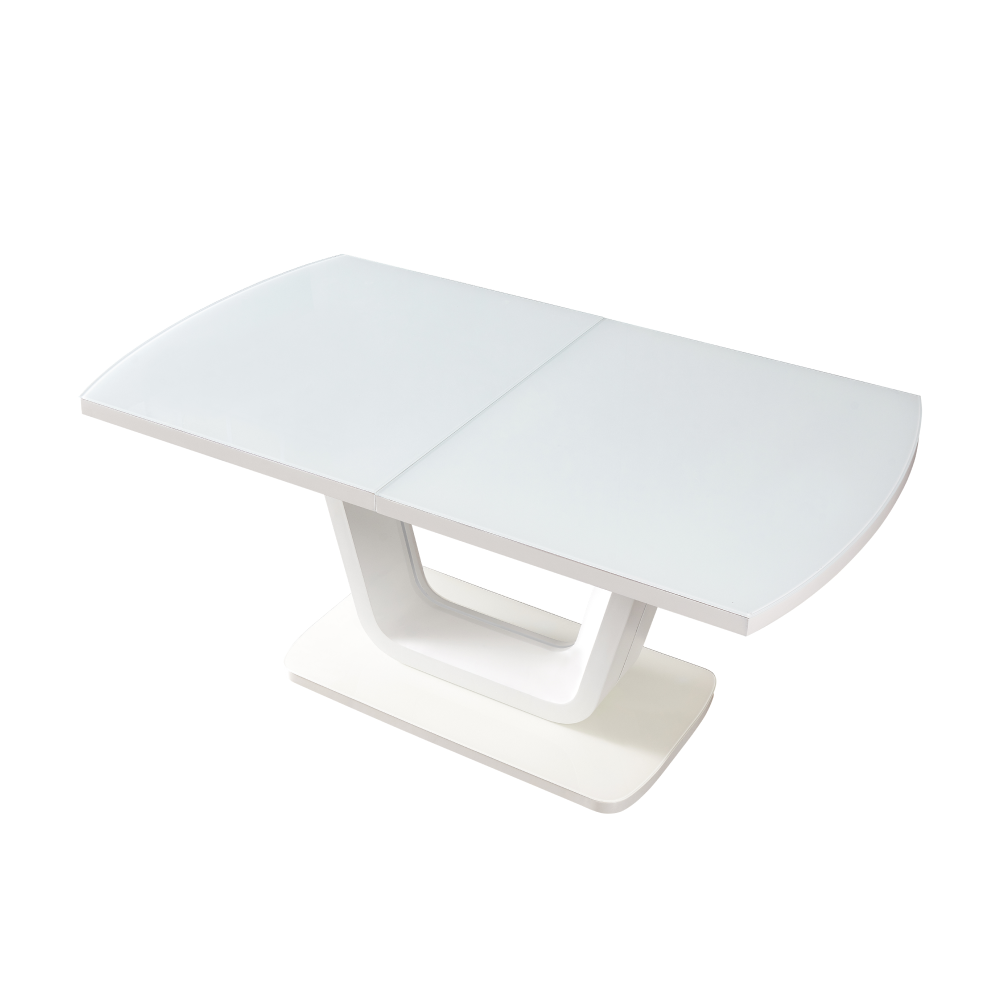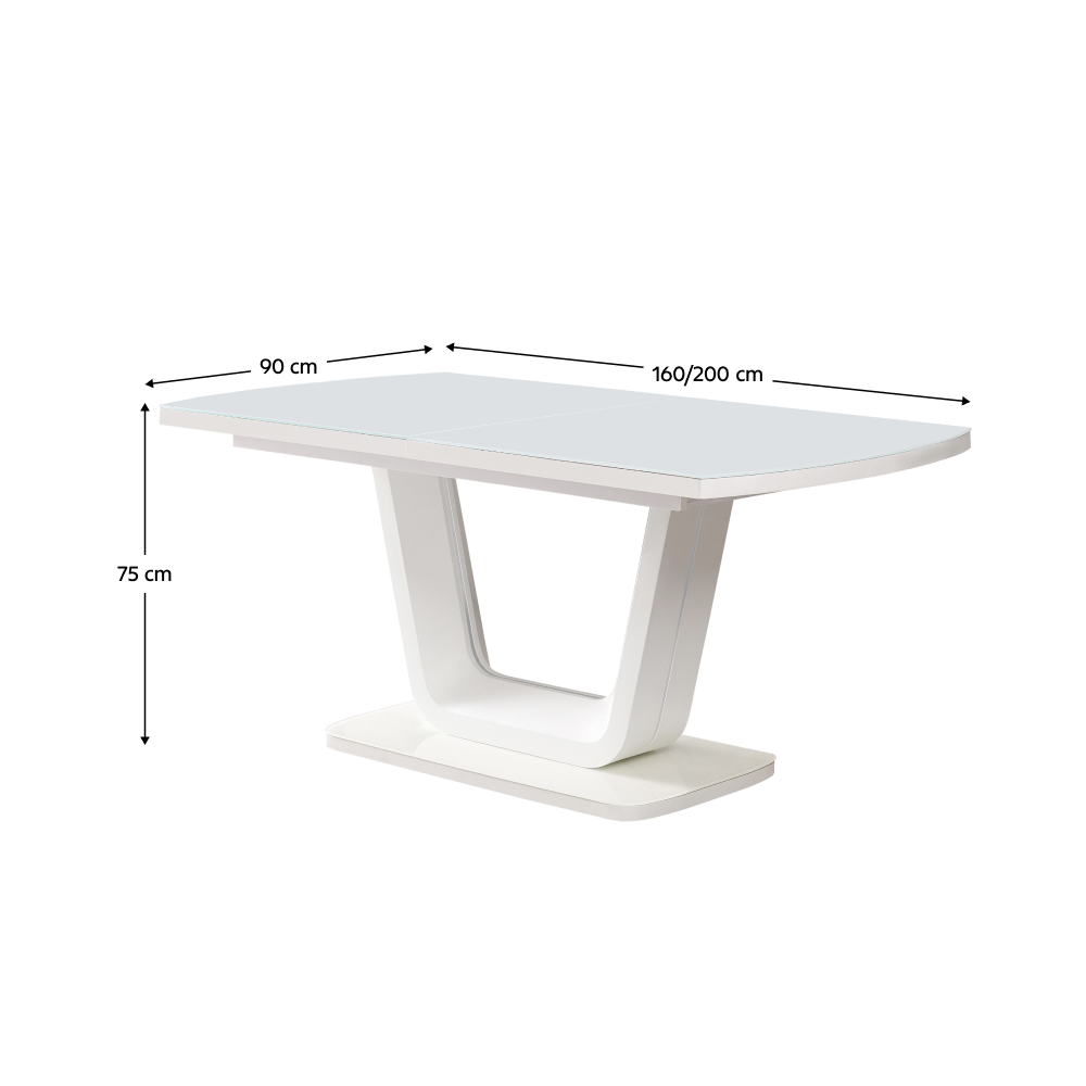 Stůl je jednoduchý, ale zároveň moderní a praktický. Disponuje funkcí rozkladu, který je vhodným řešením při rodinných oslavách a při nečekané početné návštěvě. Velká stolová deska je vyrobena z MDF v bílém barevném provedení az tvrzeného skla. Stabilitu mu zajišťují nohy vyrobené z MDF a nerezavějícího kovu. Nohy stojí na podstavě, která je vyrobena z MDF a skla v bílém barevném provedení. Díky bílé s leskem HG tento moderní kousek zapadne do každého prostoru, doplní a designově vyzvedne vaši kuchyni či jídelnu.