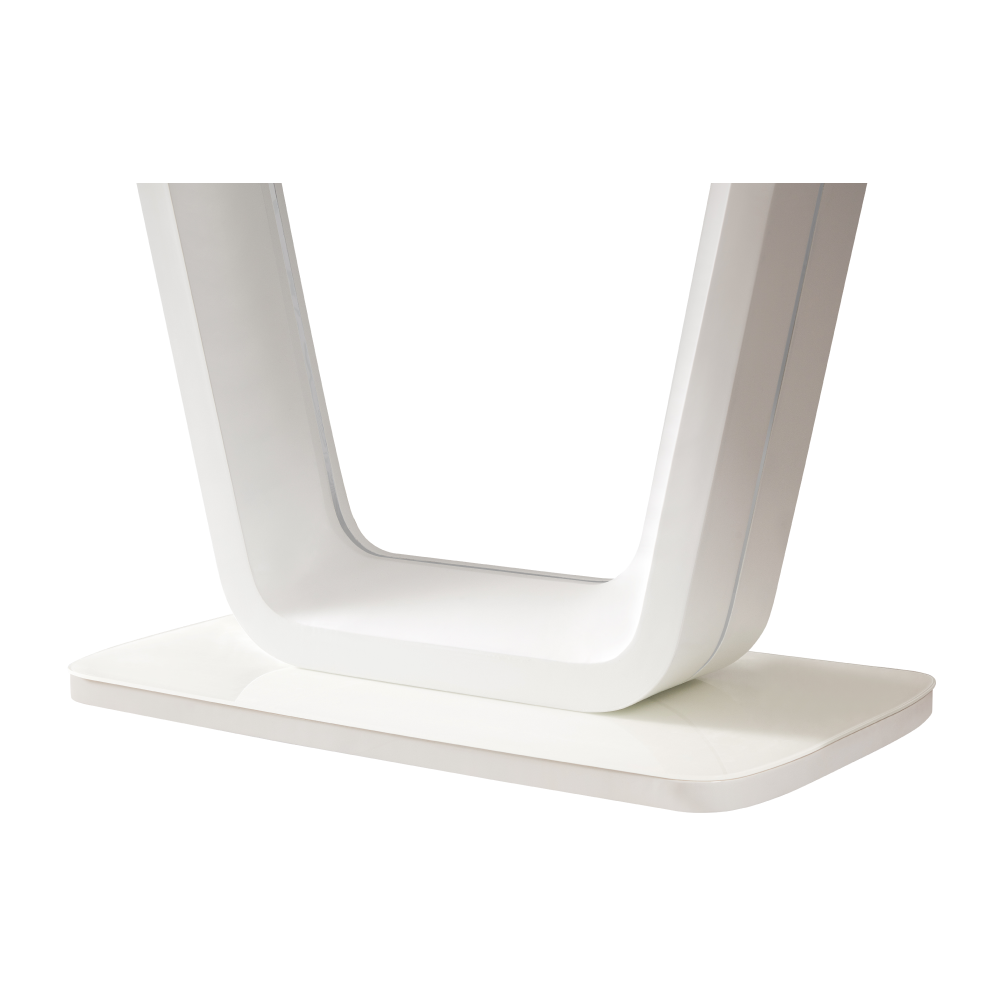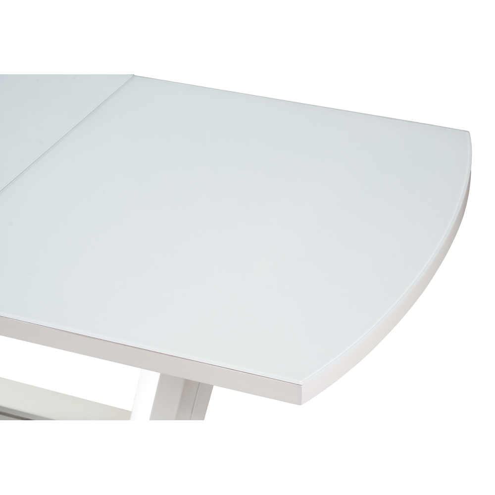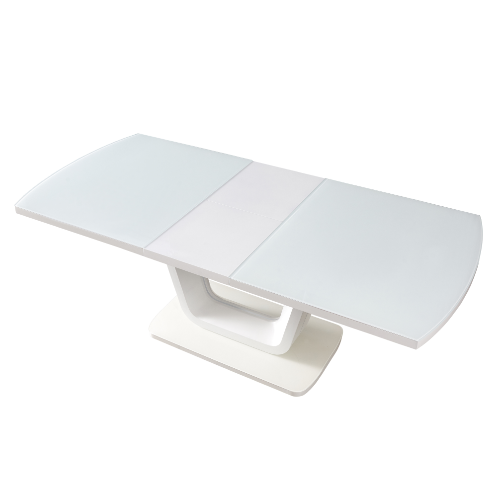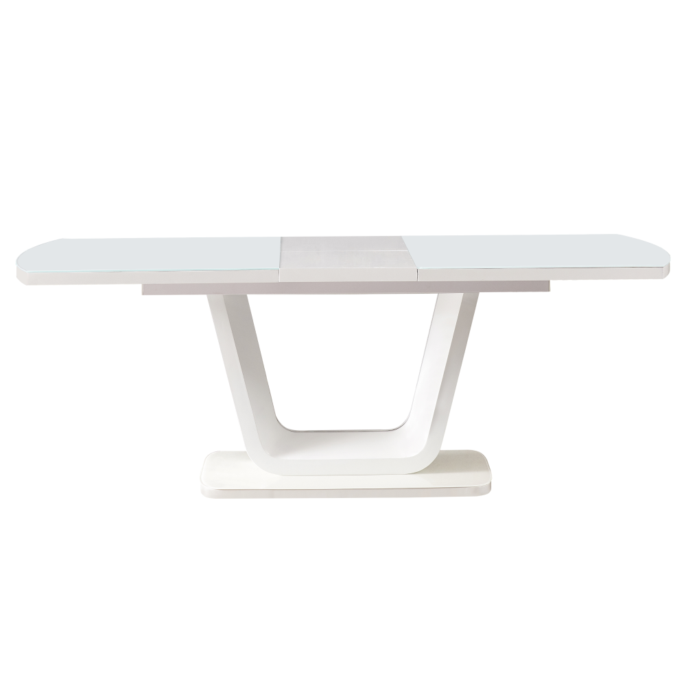 Stůl je jednoduchý, ale zároveň moderní a praktický. Disponuje funkcí rozkladu, který je vhodným řešením při rodinných oslavách a při nečekané početné návštěvě. Velká stolová deska je vyrobena z MDF v bílém barevném provedení az tvrzeného skla. Stabilitu mu zajišťují nohy vyrobené z MDF a nerezavějícího kovu. Nohy stojí na podstavě, která je vyrobena z MDF a skla v bílém barevném provedení. Díky bílé s leskem HG tento moderní kousek zapadne do každého prostoru, doplní a designově vyzvedne vaši kuchyni či jídelnu.