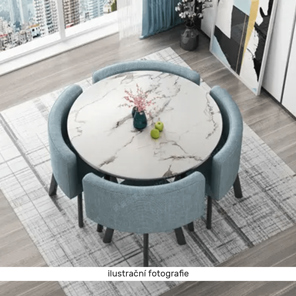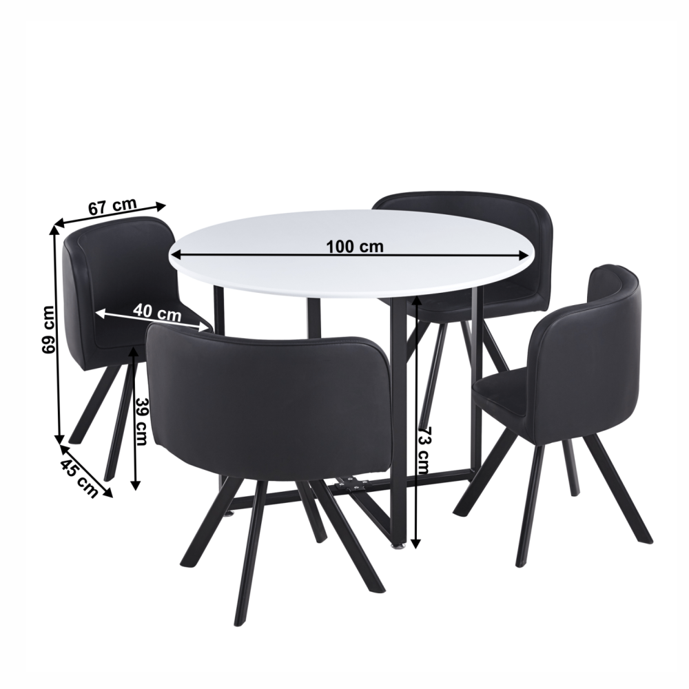 Stolní deska je vyrobená z kvalitní MDF v bílém provedení a upevněná je na pevných kovových nohách. Součástí kompletu jsou kromě stolu i čtyři křesla která jsou v černém provedení. Tento set si získá každého, protože dokáže vytvořit potřebné místo k sezení. Po použití nezabere moc místa díky tomu, že židle kopírují linie stolu a po zasunutí dokonale splynou s jeho tvary.