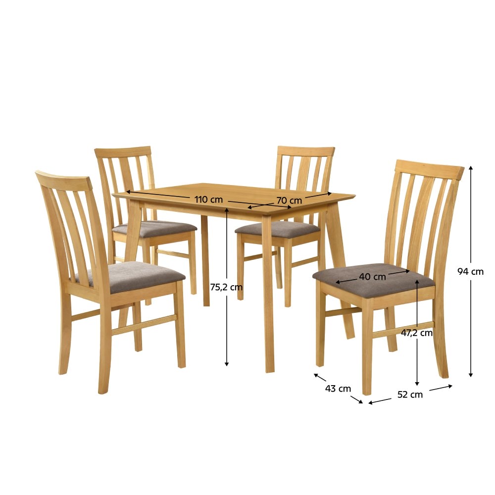 Materiál: kaučukové dřevo/MDF/dýha/látka Barva: dub sonoma světlý/tmavě hnědá Rozměry stůl (ŠxHxV): 110x70x75,2 cm Rozměry židle (ŠxHxV): 51,9x43x94 cm Výška sedu: 47,2 cm Hloubka sedu: 40 cm Nosnost stolu: 100 kg Nosnost židle: 100 kg Jídelní set 1 stůl 4 židle Pro 4 osoby Dodáváno v demontu