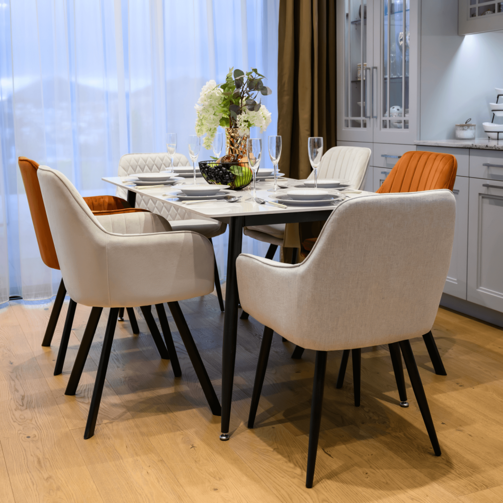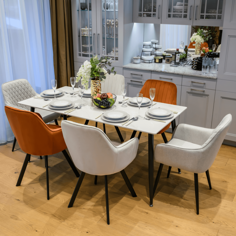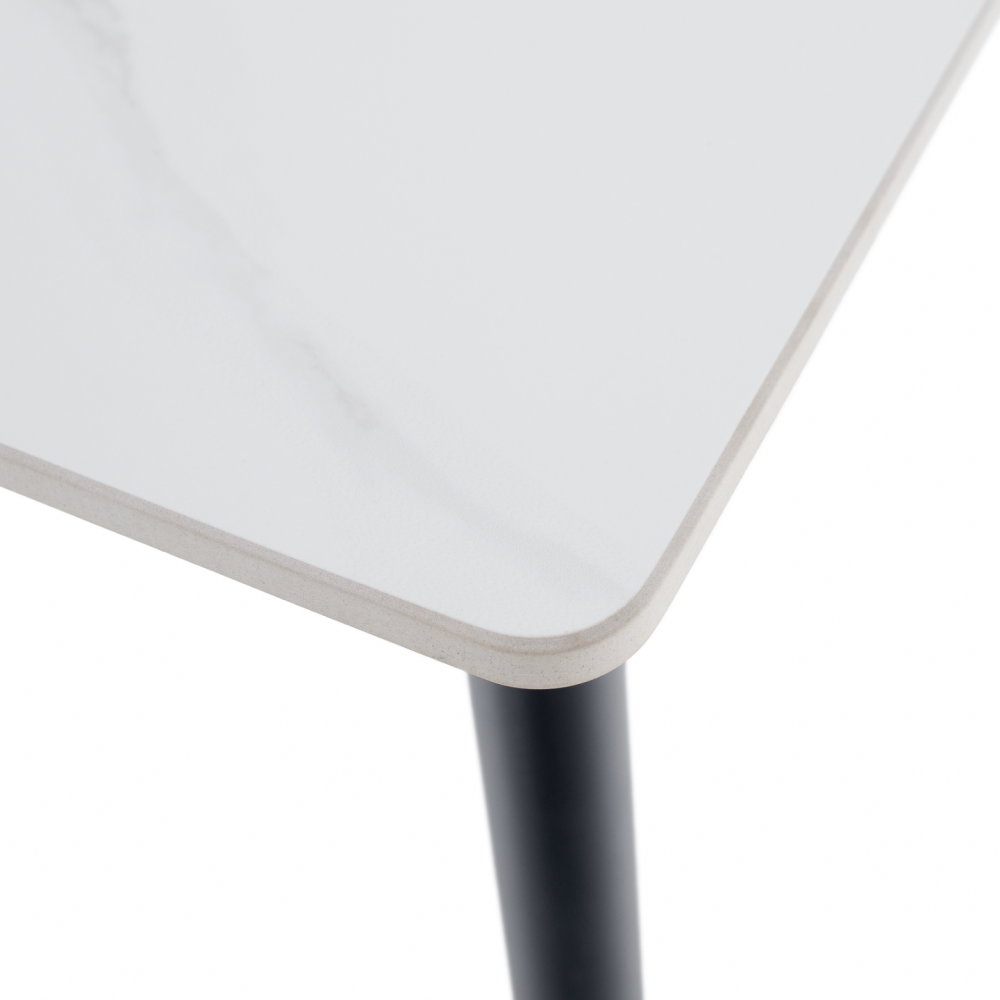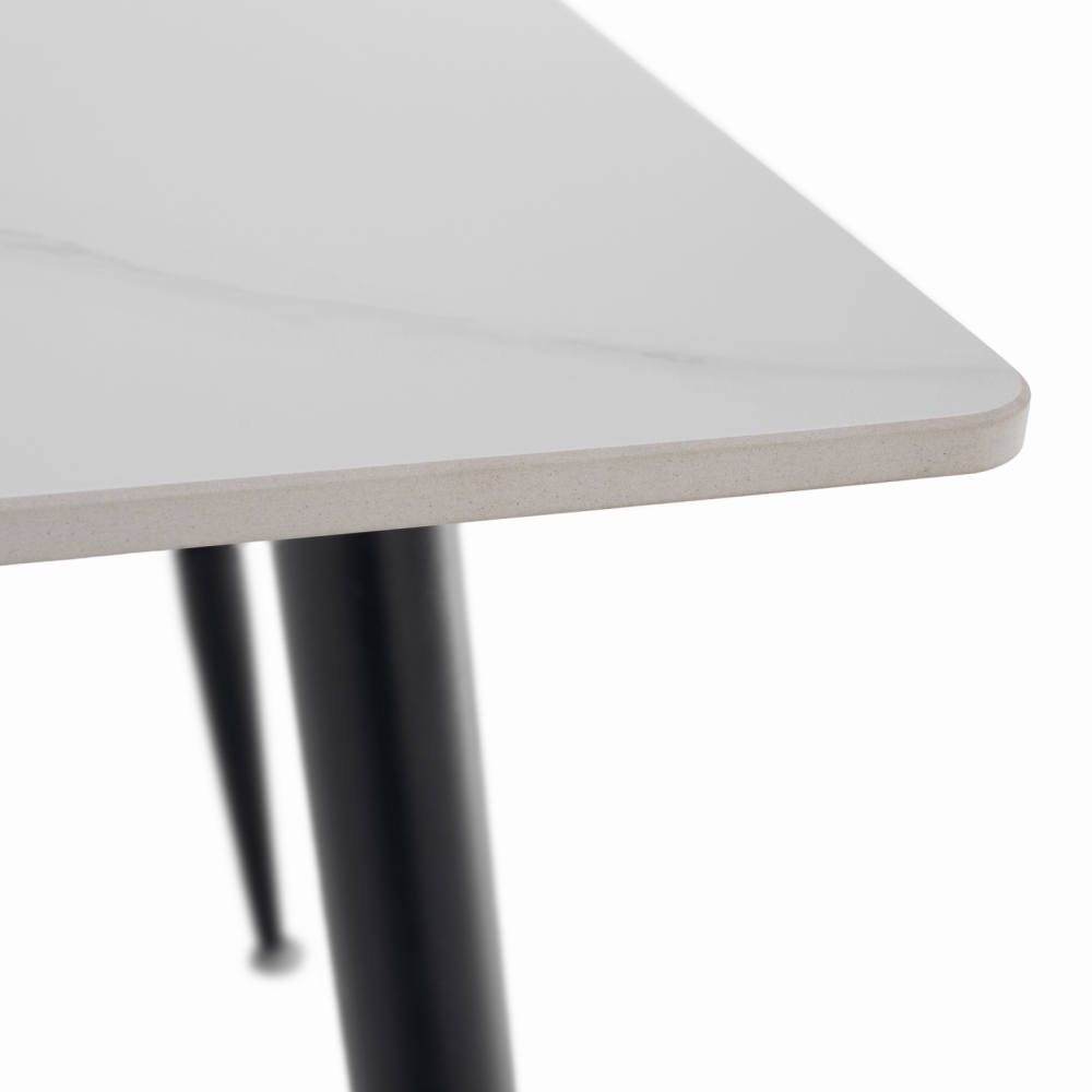 Stůl má pevný a nadčasový keramický plát v dekoru bílý mramor. Stabilita stolu je zajištěna ocelovými černými nožičkami. Svým minimalistickým designem se hodí do každého interiéru, od tradičního po moderní a snadno se kombinuje s různými typy židlí. Stůl poskytuje dostatek prostoru pro pohodlné stolování pro čtyři až šest osob. Neutrální vzhled a kvalitní zpracování z jídelního stolu FLORENC typ 2 činí nadčasový doplněk do každé domácnosti.