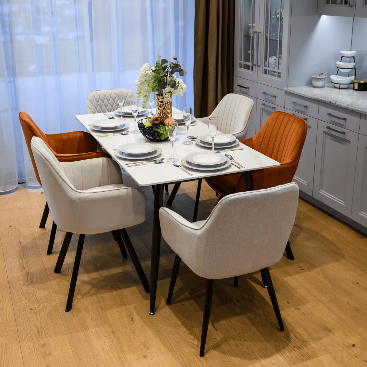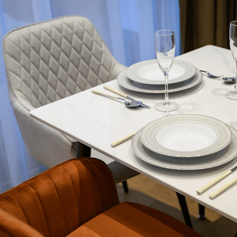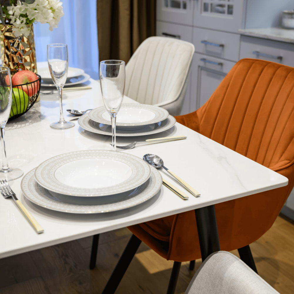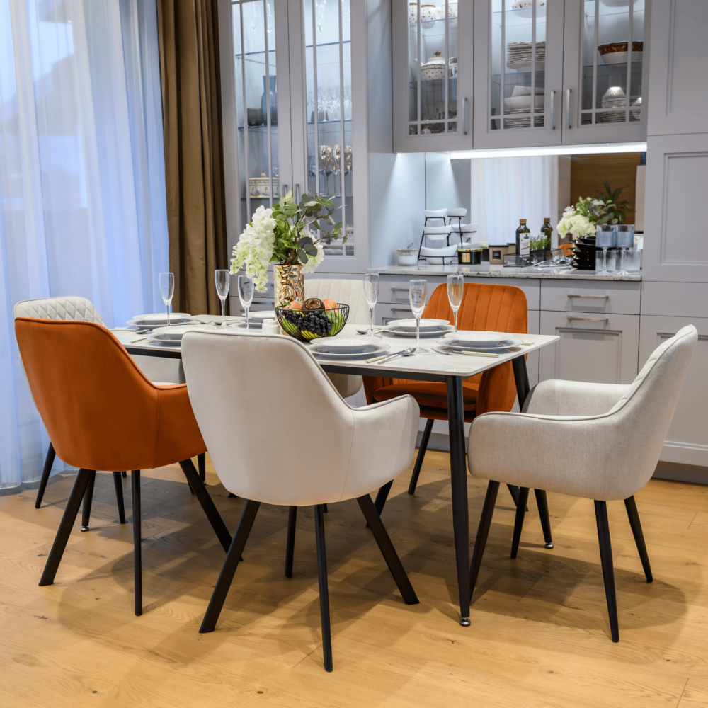 Stůl má pevný a nadčasový keramický plát v dekoru bílý mramor. Stabilita stolu je zajištěna ocelovými černými nožičkami. Svým minimalistickým designem se hodí do každého interiéru, od tradičního po moderní a snadno se kombinuje s různými typy židlí. Stůl poskytuje dostatek prostoru pro pohodlné stolování pro čtyři až šest osob. Neutrální vzhled a kvalitní zpracování z jídelního stolu FLORENC typ 2 činí nadčasový doplněk do každé domácnosti.