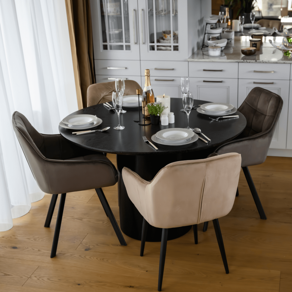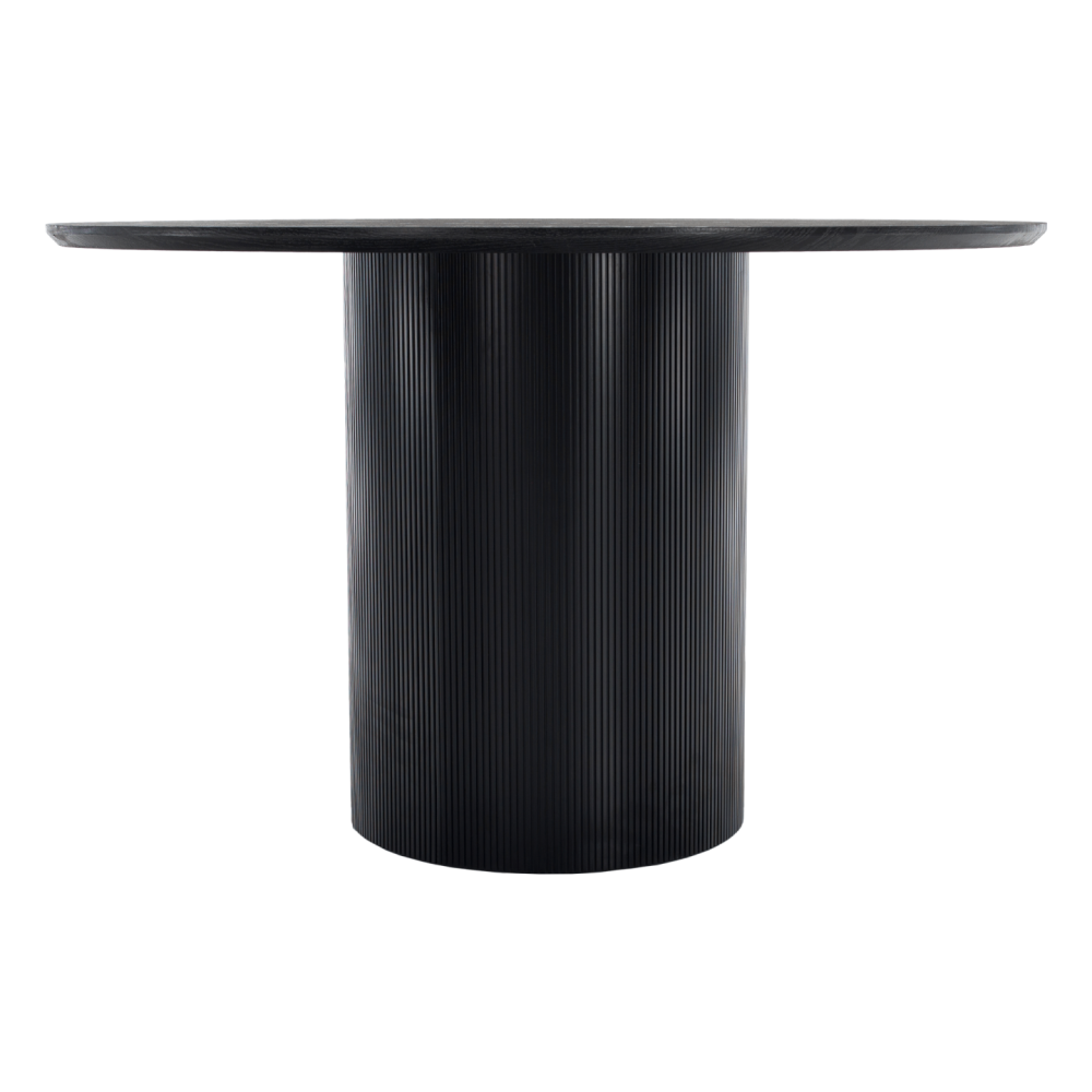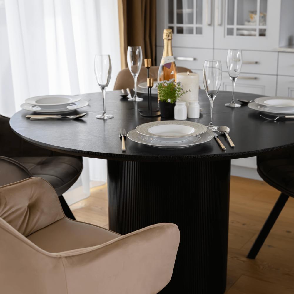 Materiál: dyhovaná MDF Barevné provedení: černá Rozměry stolku (PxV): 120x75 cm Tloušťka platu stolu: 2,5 cm Originální kousek Kulatý Moderní a stylový Nosnost: 50 kg Dodáváno v demontu