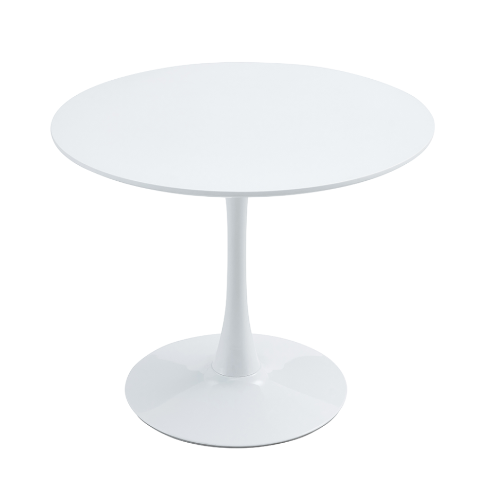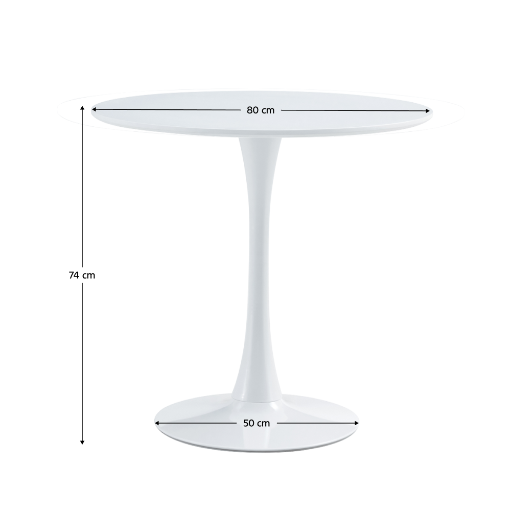 Jídelní stůl REVENTON Materiál: MDF laminovaná/ kov Barva: bílá matná Rozměry (průměr x V): 80x74 cm Tloušťka plátu stolu: 1,8 cm Průměr podstavy: 50 cm moderní design kulatý Dodávané v demontu.