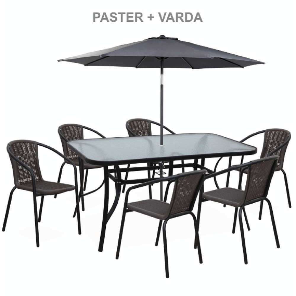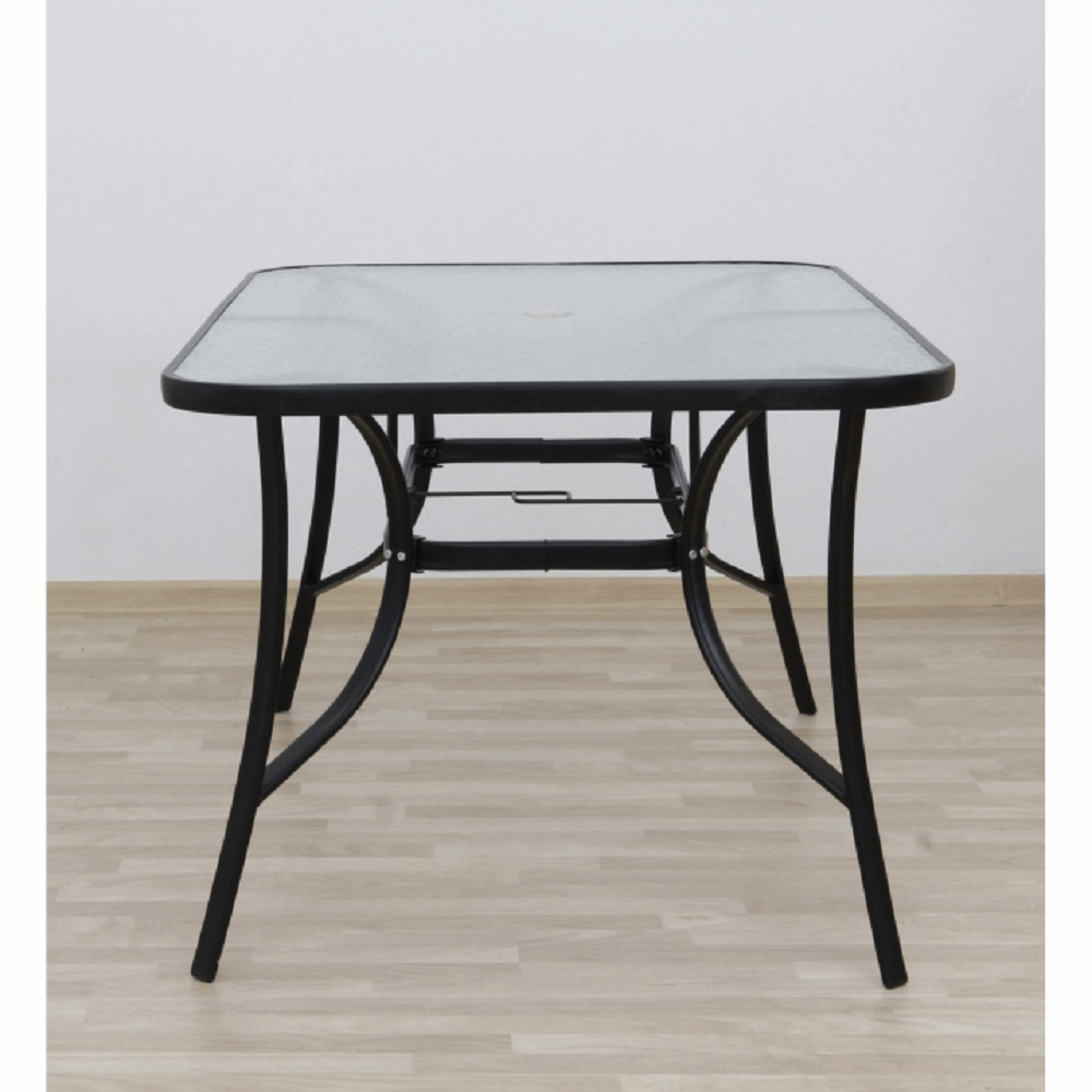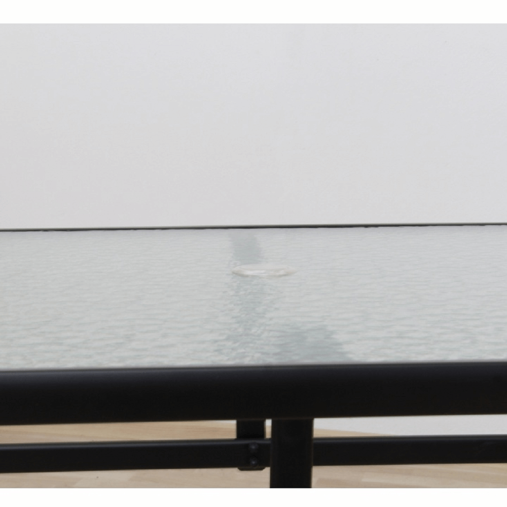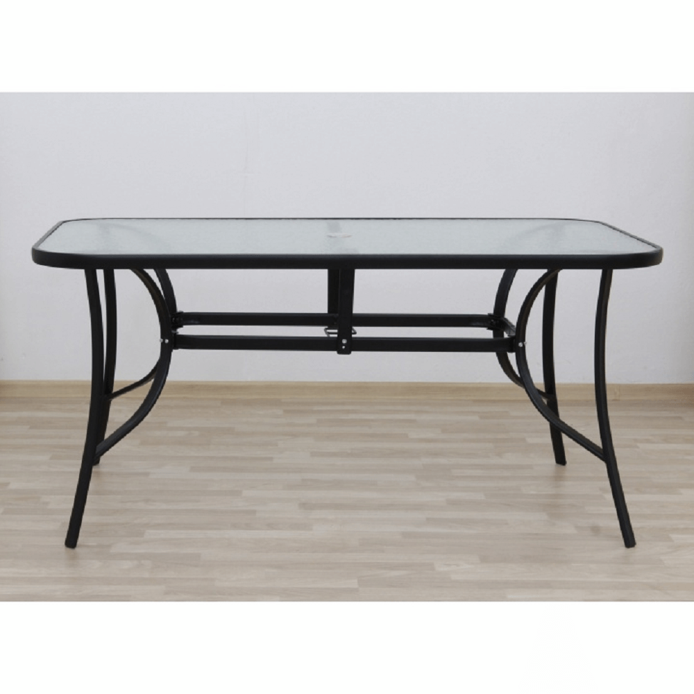Jídelní stůl Paster vhodný k zahradnímu setu Materiál: tvrzené sklo / černá ocel Rozměry (ŠxHxV): 150x90x70 cm Stůl je předpřipravených na osazení slunečníku Pro šest osob Dodávané v demontu.