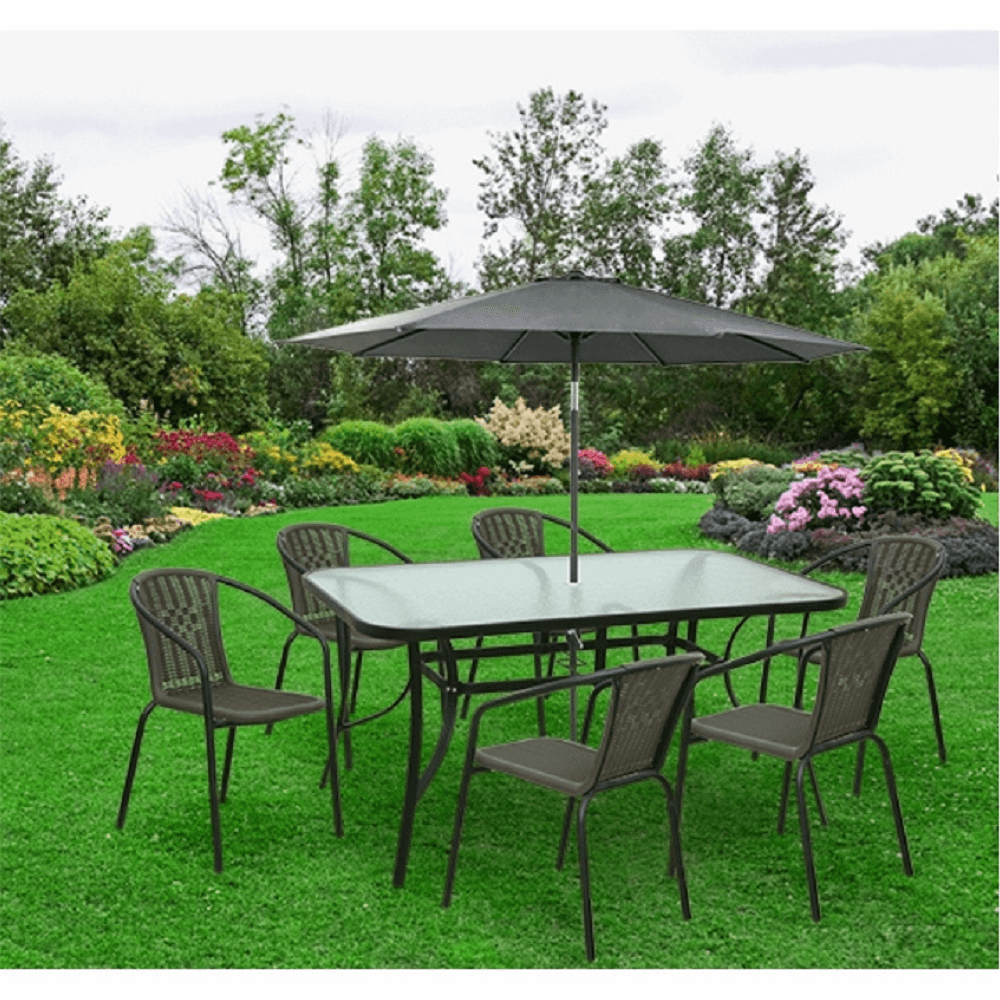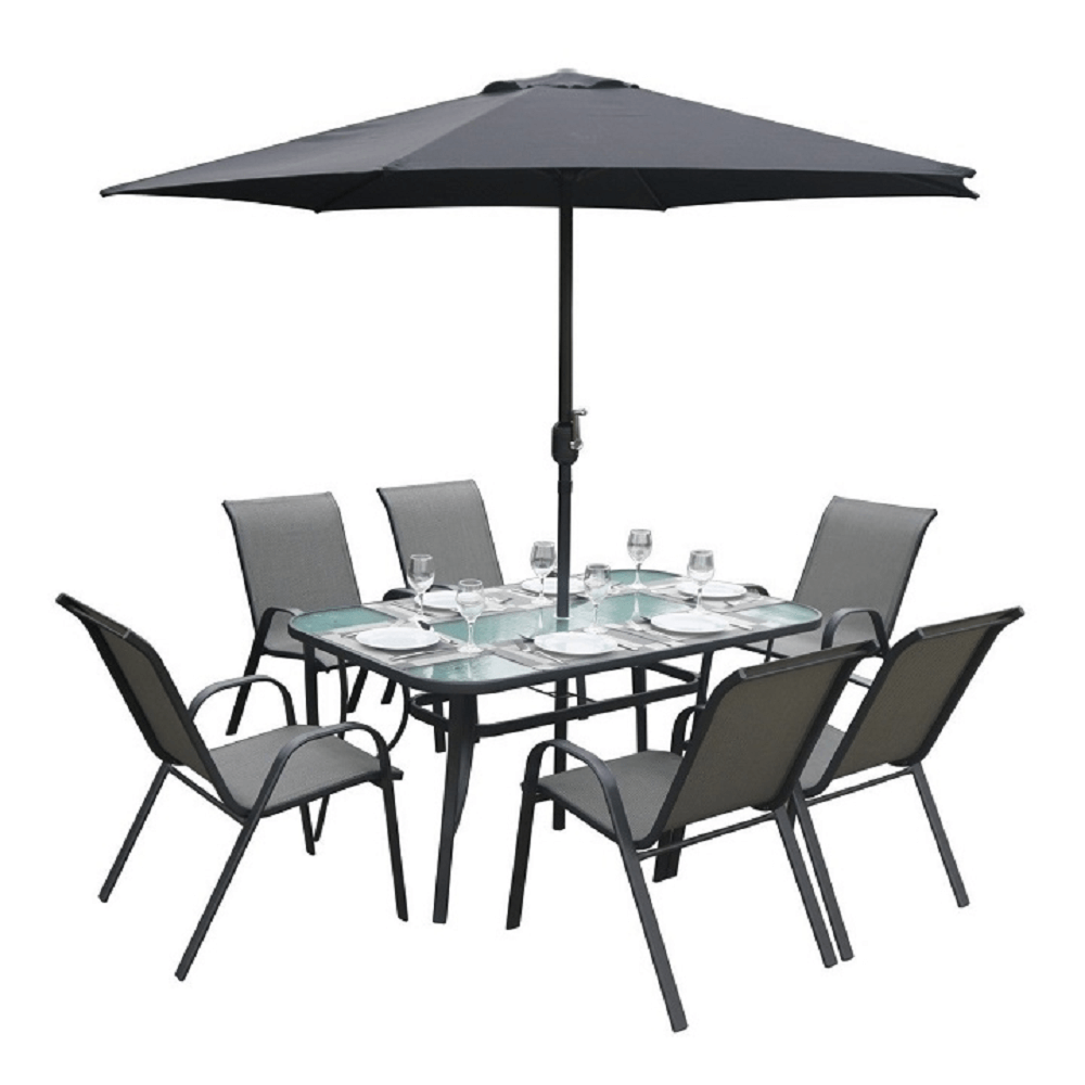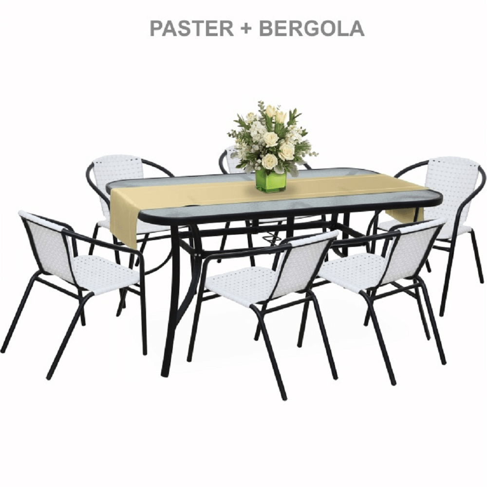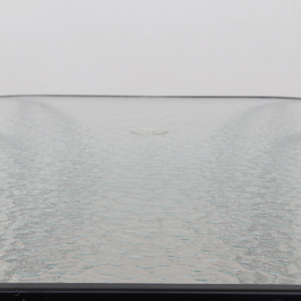 Jídelní stůl Paster vhodný k zahradnímu setu Materiál: tvrzené sklo / černá ocel Rozměry (ŠxHxV): 150x90x70 cm Stůl je předpřipravených na osazení slunečníku Pro šest osob Dodávané v demontu.