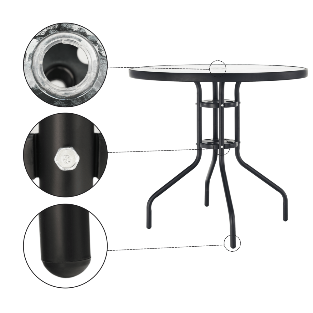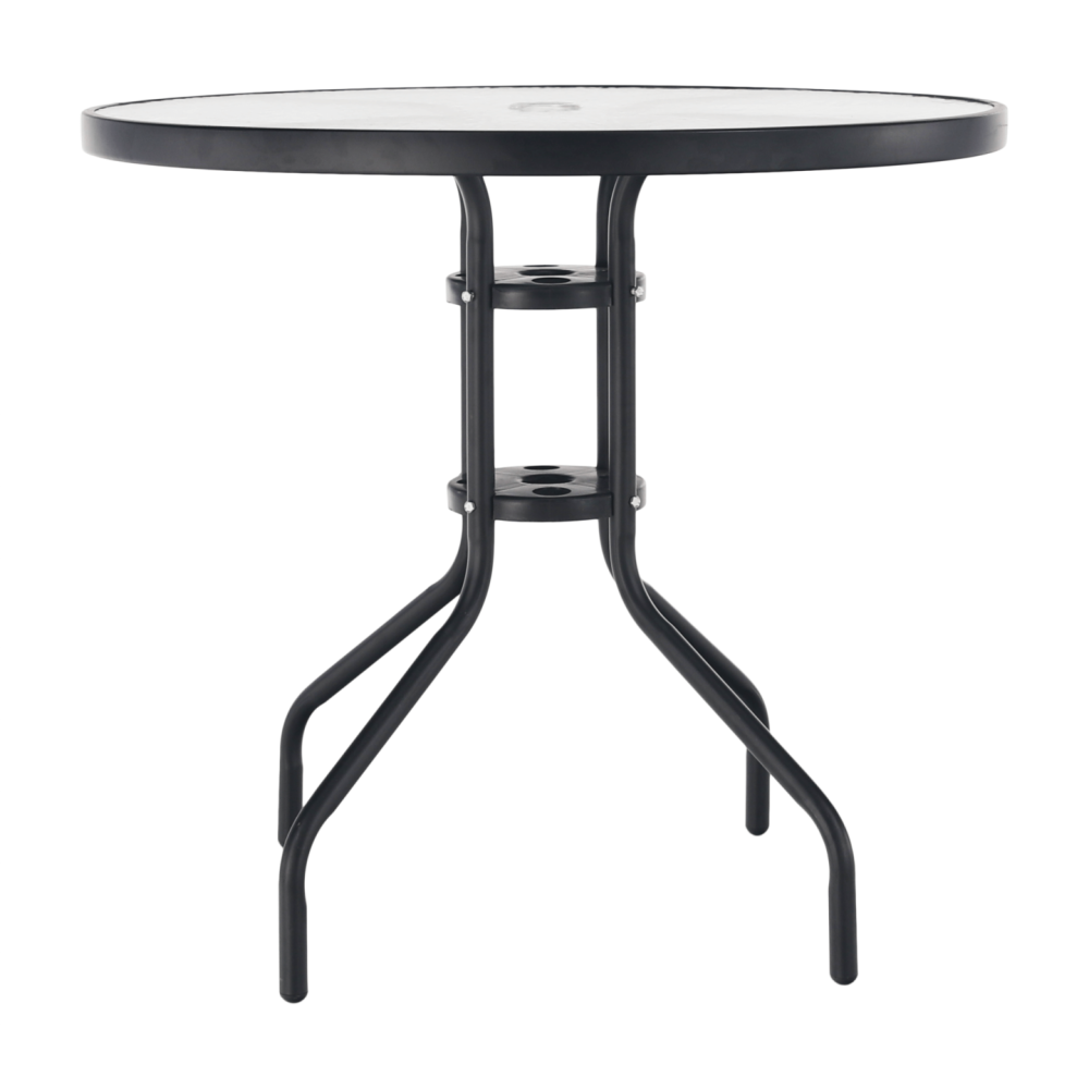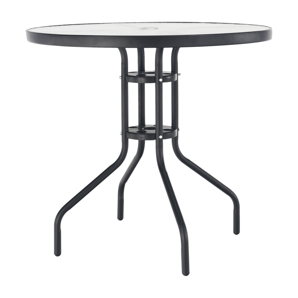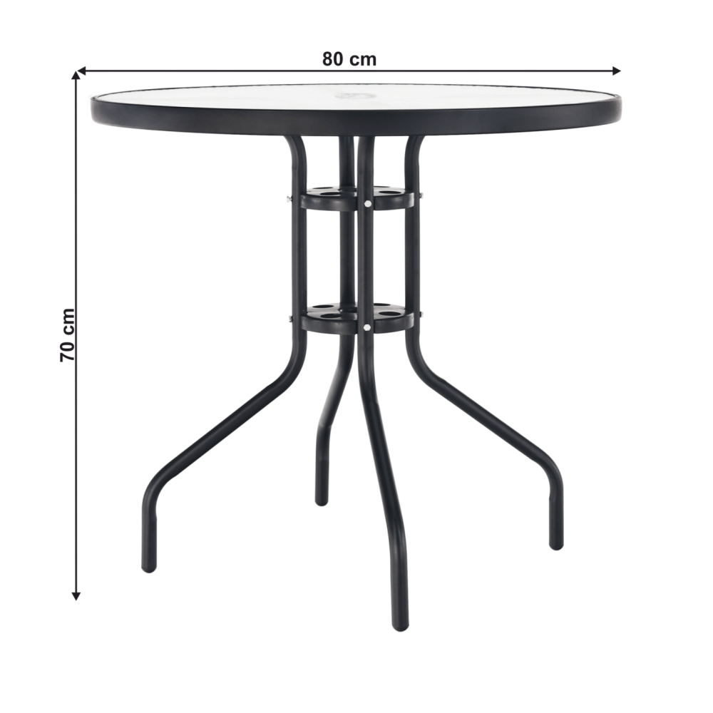 Jídelní stůl vhodný k zahradnímu setu Materiál: tvrzené sklo / ocel Barva: černá Rozměry (ŠxHxV): 80x80x70 cm S otvorem na slunečník Vhodné kombinovat se židlemi Lestra, Doren, Varda, Bergola.