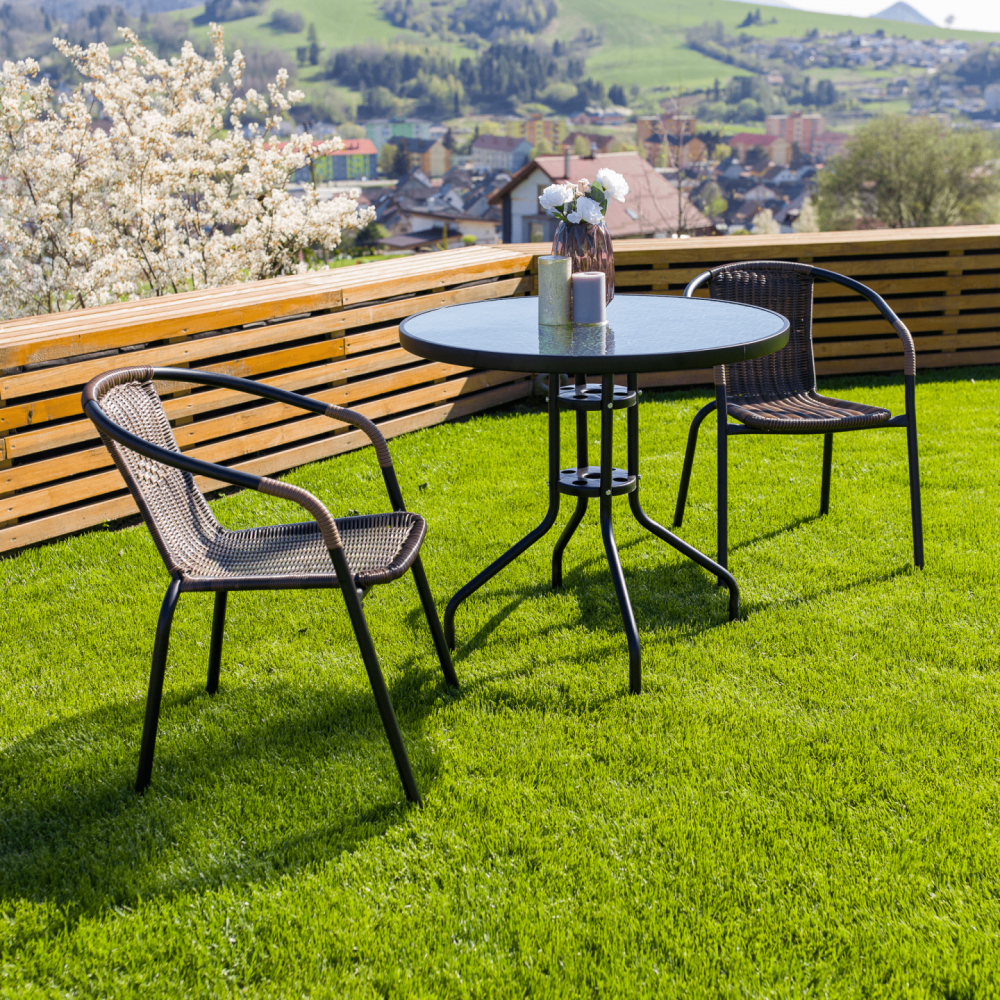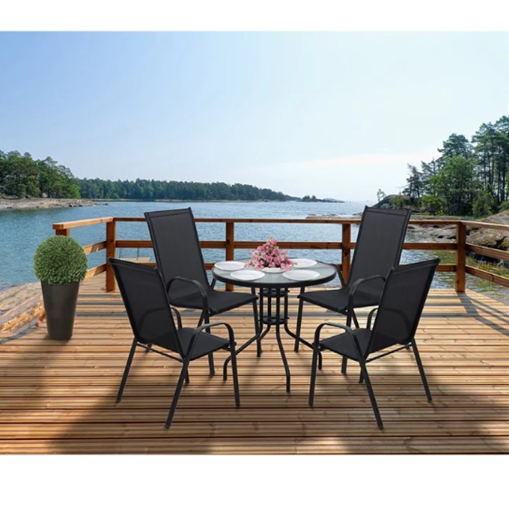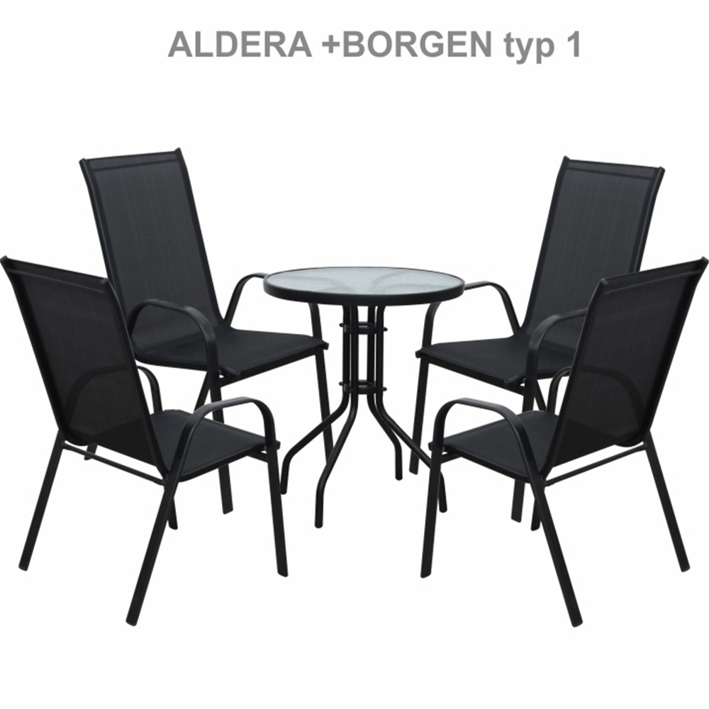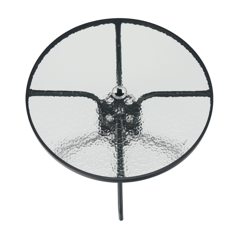 Jídelní stůl vhodný k zahradnímu setu Materiál: tvrzené sklo / ocel Barva: černá Rozměry (ŠxHxV): 80x80x70 cm S otvorem na slunečník Vhodné kombinovat se židlemi Lestra, Doren, Varda, Bergola.