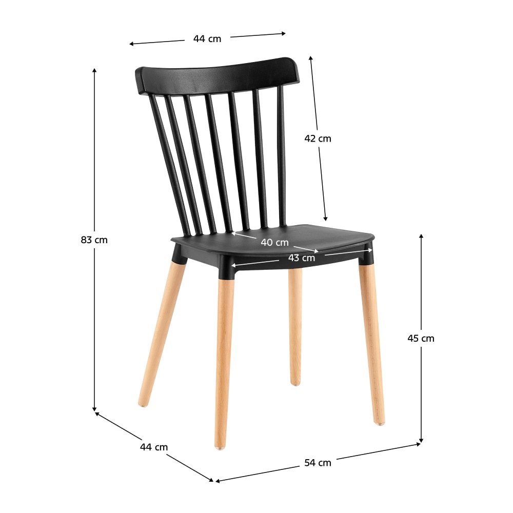 Materiál: plast/masivní bukové dřevo Barva: černá/buk Rozměry (ŠxHxV): 54x44x83 cm Výška sedu: 45 cm Hloubka sedu: 40 cm Šířka zádové opěrky: 44 cm Výška zádové opěrky: 42 cm Nosnost: 100 kg Dodáváno v demontu