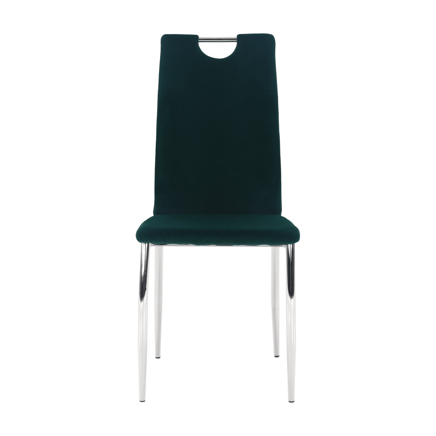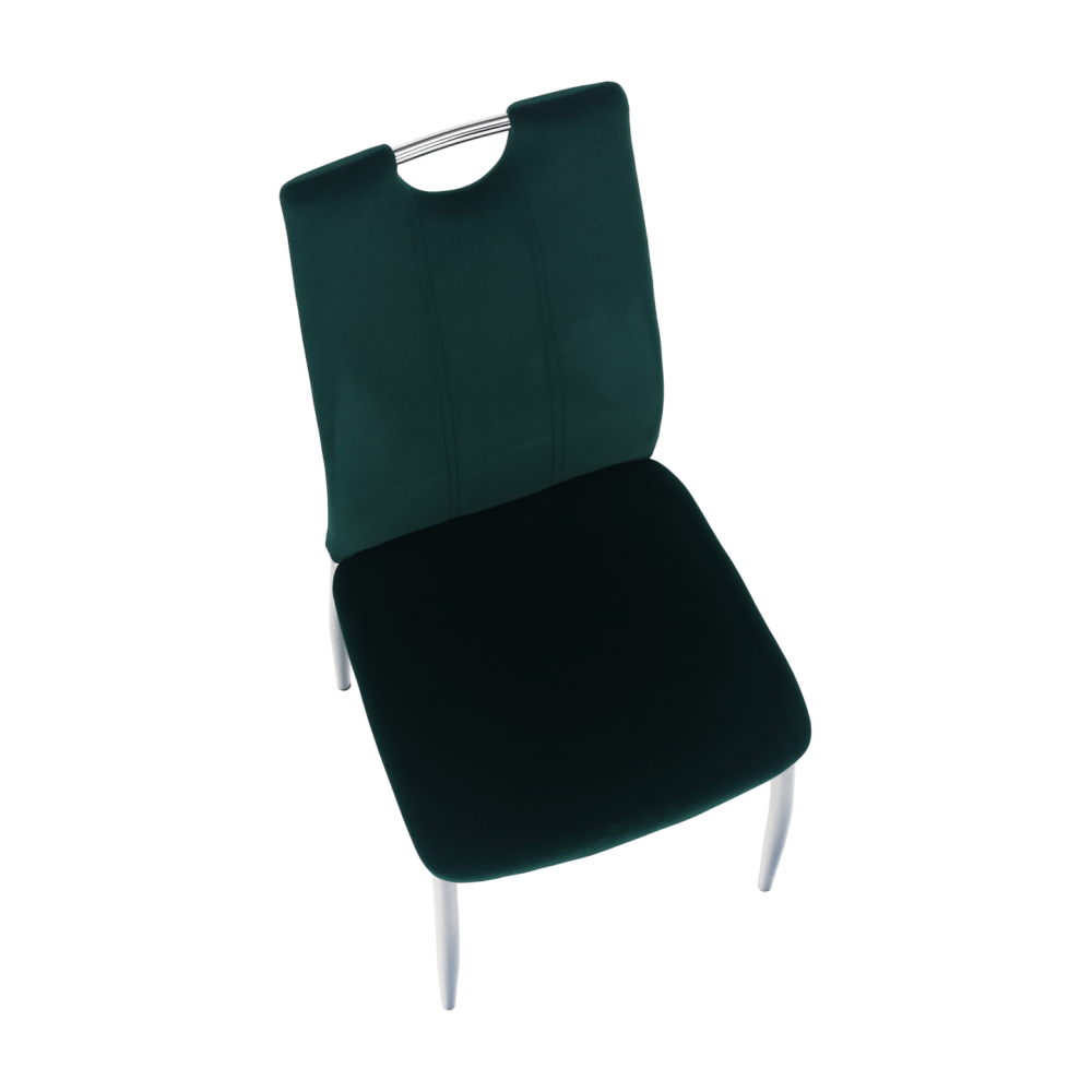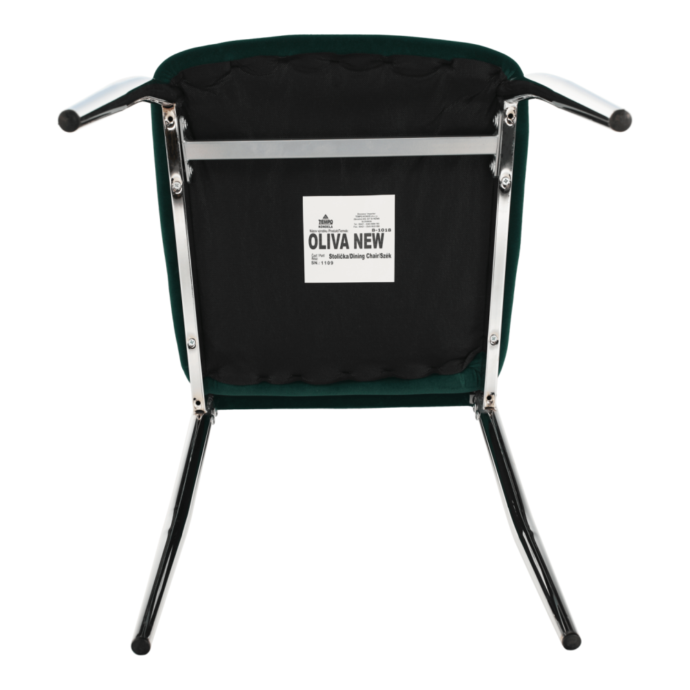 Jídelní židle OLIVA NEW Material: Velvet látka / chrom Barva: smaragdová / chrom Oděruodolnost textilie podle testu Martindale: 85 000 oděrek Rozměry (ŠxHxV): 42x52x97 cm Hloubka sedu: 40 cm Výška sedu: 46 cm Šířka sedu: 42 cm Nosnost: 110 kg Dodávané v demontu.