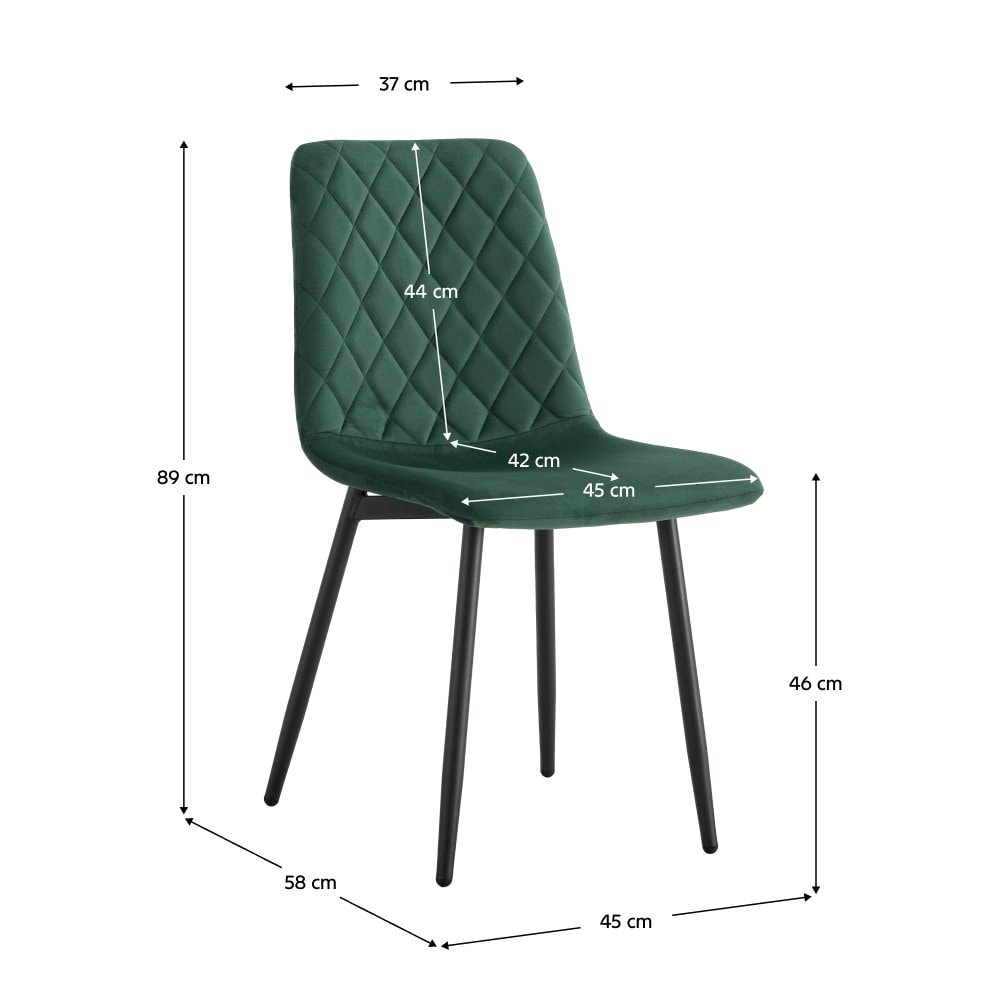Materiál: látka Velvet/kov Oděruodolnost textilie podle testu Martindale: 80 000 oděrů Barva: smaragdová/černá Rozměry (ŠxHxV): 45x58x89 cm Výška sedu: 46 cm Hloubka sedu: 42 cm Šířka sedu: 45 cm Výška zádové opěrky: 44 cm Šířka zádové opěrky: 37 cm Nosnost: 110 kg Dodáváno v demontu