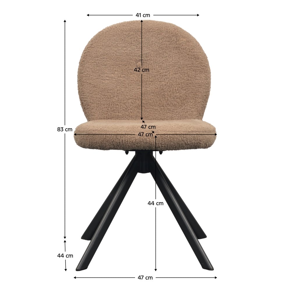 Materiál: látka Bouclé/kov Oděruodolnost textilie podle testu Martindale: 45 000 oděrů Barva: světle hnědá/černá Rozměry (ŠxHxV): 47x44x83 cm Výška sedu: 44 cm Šířka sedu: 47 cm Hloubka sedu: 47 cm Výška zádové opěrky: 42 cm Šířka zádové opěrky: 41 cm Nosnost: 100 kg Hmotnost: 6,2 kg Otočná Jídelní…