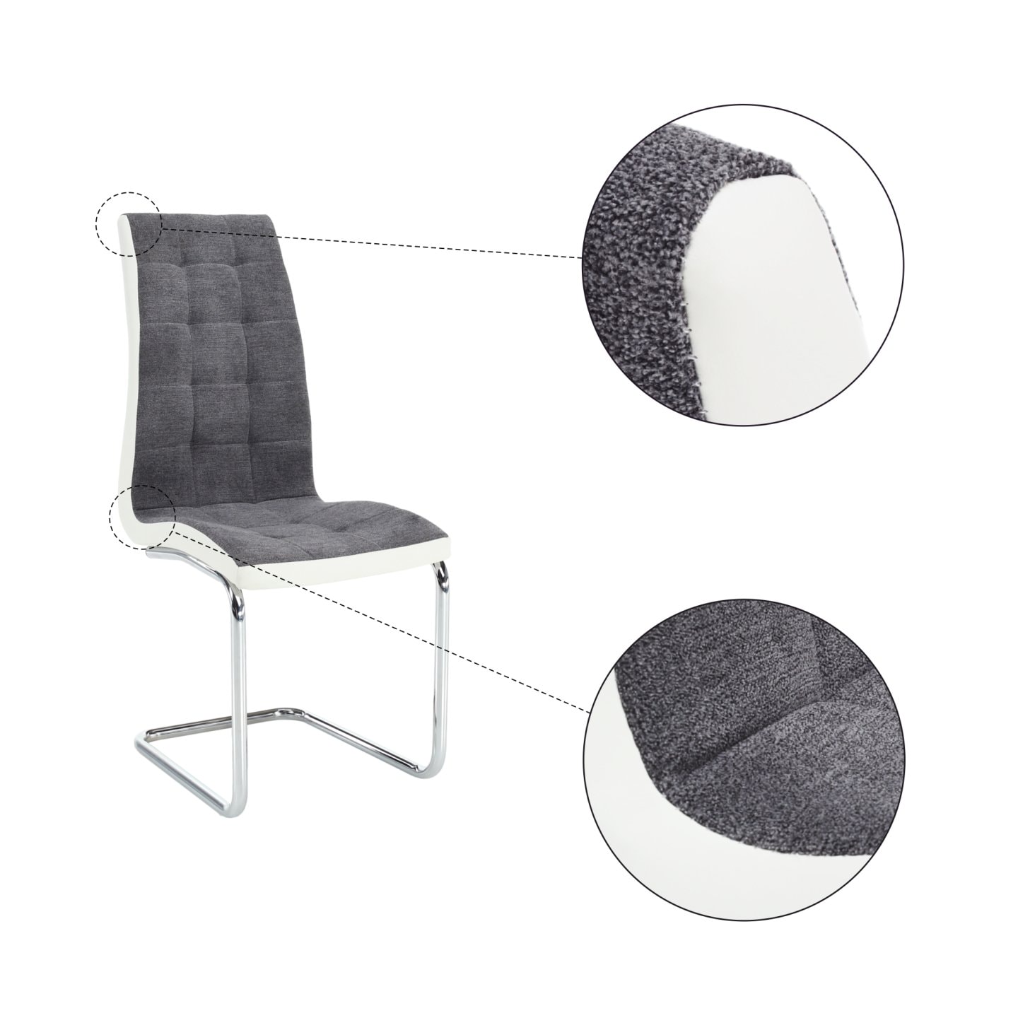 Jídelní židle SALOMA NEW Materiál: látka / ekokůže / chrom v barevném provedení tmavě šedá a bílá., Oděruodolnost textilie podle testu Martindale: 50 000/100 000 oděrek Rozměry (ŠxHxV): 42x56,5x105 cm Nosnost: 110 kg