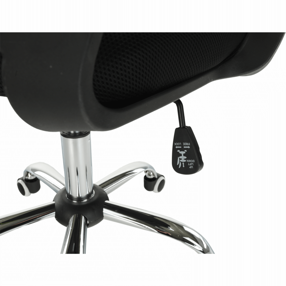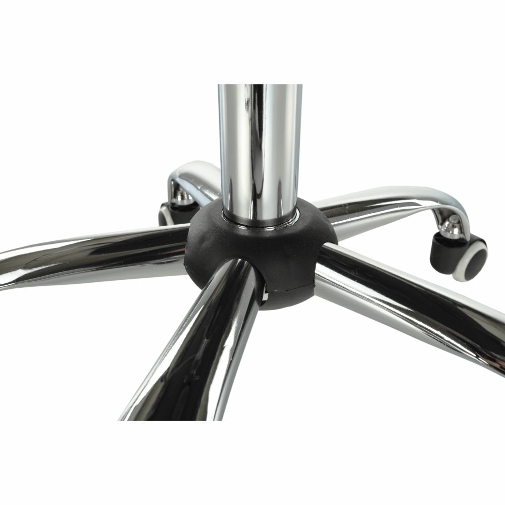Na čalounění byla použita kvalitní černá látka a šedá síťovina. Kovová růžice je pochromovaná.