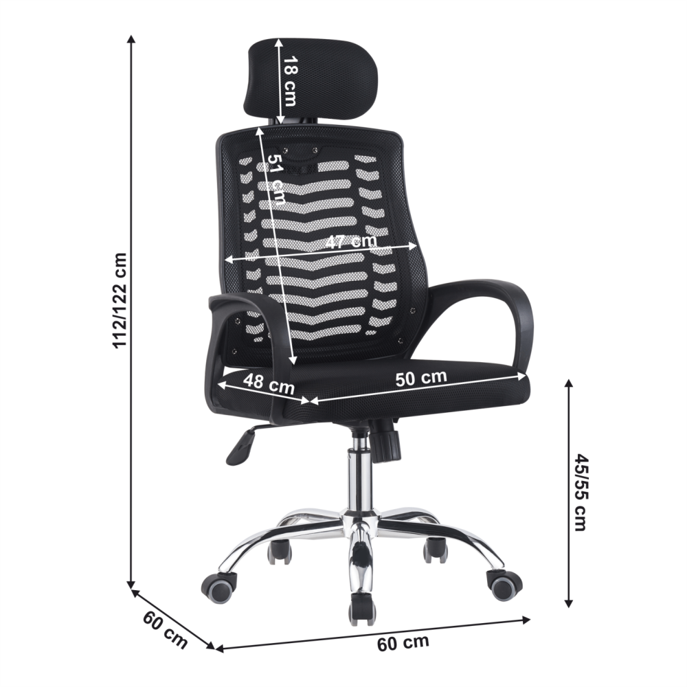Materiál čalounění: síťovina Oděruodolnost textilie podle testu Martindale: 90 000 oděrů Barva: černá Materiál konstrukce: plast/kov Barva: černá/chromová povrchová úprava Rozměry (ŠxHxV): 60x60x112-122 cm Výška sedu: 45-55 cm Hloubka sedu: 48 cm Šířka sedu: 50 cm Výška zádové opěrky: 51 cm Šířka…