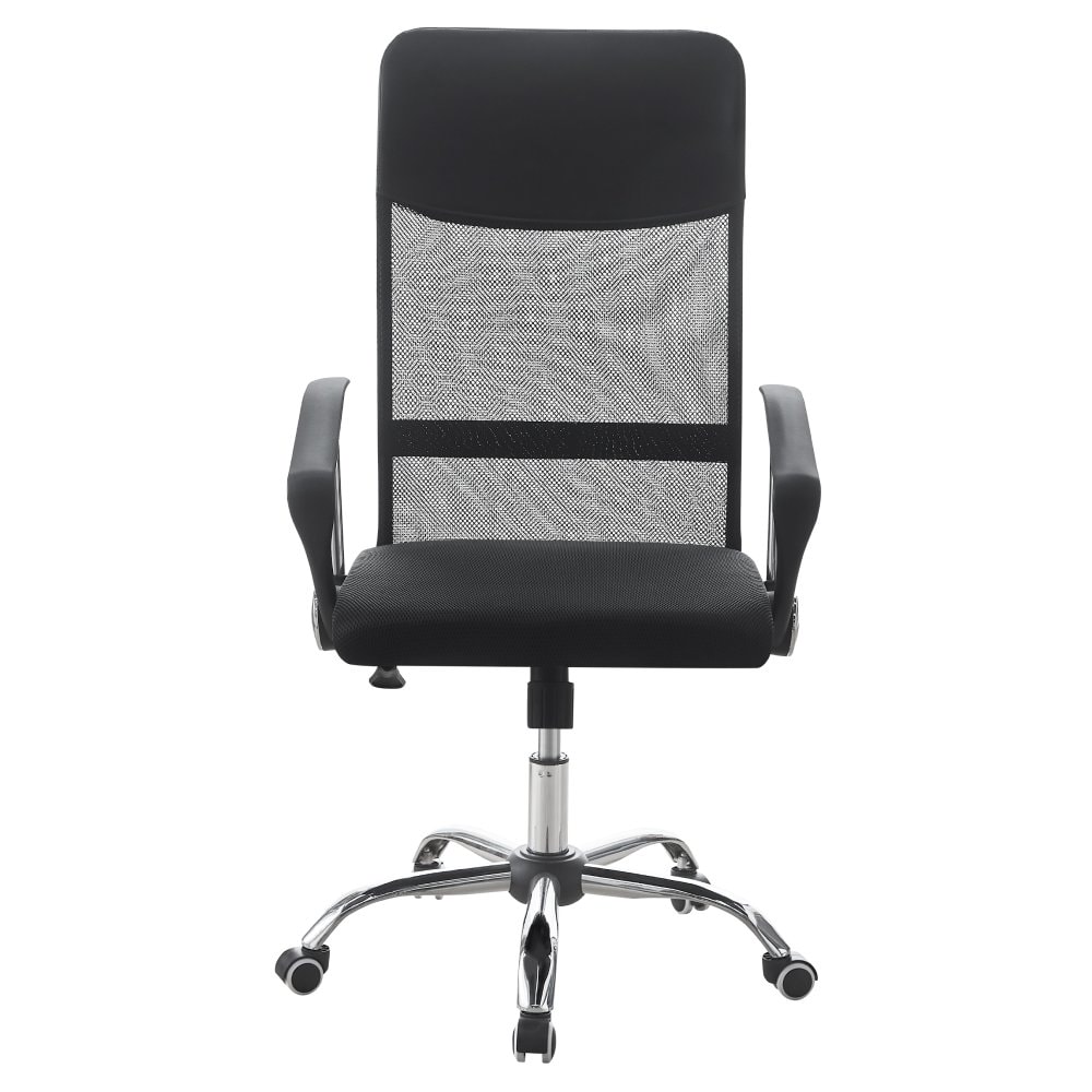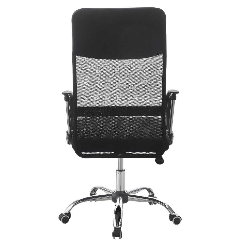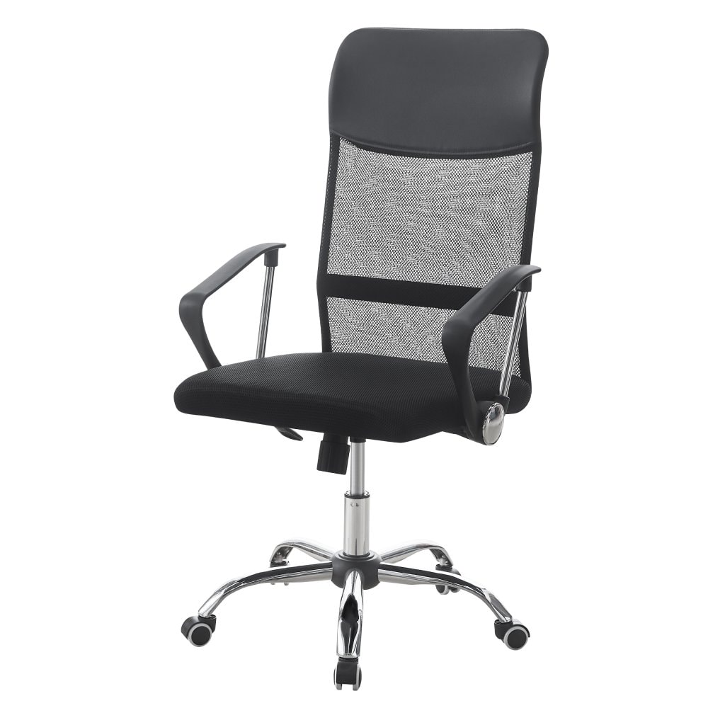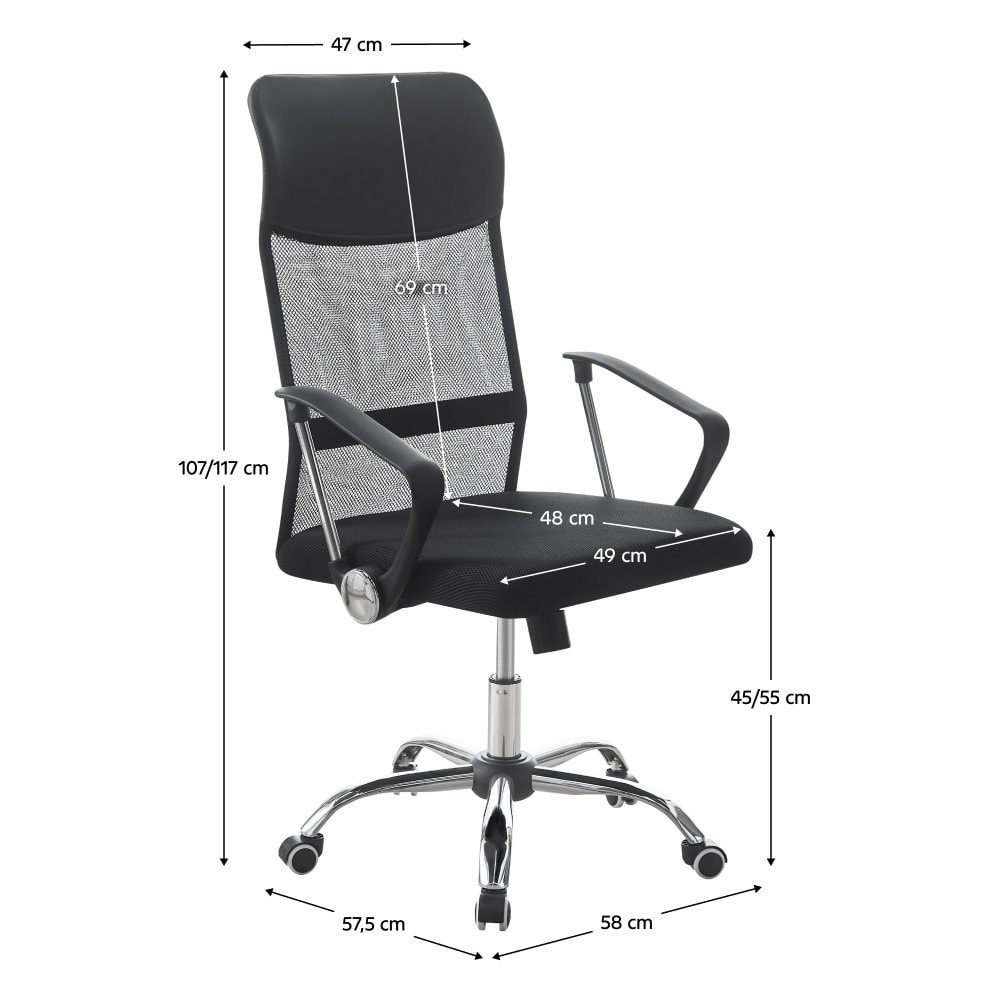 Materiál: ekokůže/síťovina/plast/kov Oděruodolnost ekokůže podle testu Martindale: 100 000 oděrů Oděruodolnost textilie podle testu Martindale: 90 000 oděrů Barva: černá/chrom Rozměry (ŠxHxV): 58x57,5x107-117 cm Nastavitelná výška sedu Výška sedu: 45-55 cm Hloubka sedu: 48 cm Šířka sedu: 49 cm Šířka zádové opěrky: 47 cm Výška zádové opěrky: 69 cm Nosnost: 100 kg Otočná Univerzální kolečka Kolečka vhodná pro měkké i tvrdé podlahy Mechanismus houpání Kancelářské Kovová růžice, plastové opěrky rukou Dodáváno v demontu