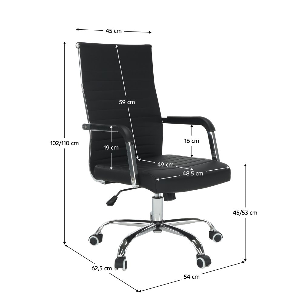 Moderní kancelářské křeslo FARAN Barva: černá / chrom Materiál: ekokůže Oděruodolnost ekokůže podle testu Martindale: 100 000 oděrek Rozměry (ŠxHxV): 54x62,5x102-110 cm Výška sedu: 45-53 cm Hloubka sedu: 49 Nosnost: 110 kg Opěrka zad (ŠxV): 45x59 cm Sedadlo (ŠxH): 48,5x49 cm Univerzální kolečka…