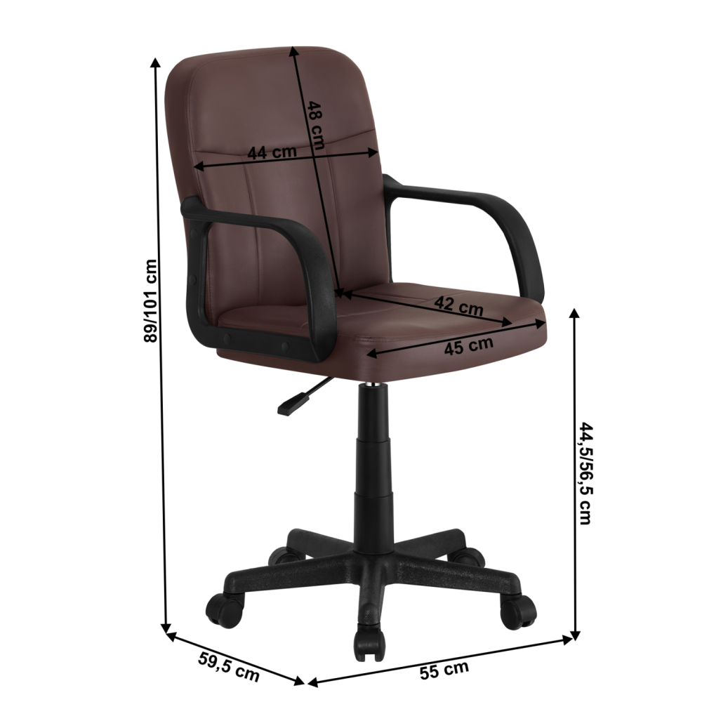 Kancelářské křeslo AYLA NEW Materiál: ekokůže/plast Oděruodolnost textilie podle testu Martindale: 100 000 oděrů Barva: hnědá/černá Rozměry (ŠxHxV): 55x59,5x89-101 cm Výška sedu: 44,5-56,5 cm Hloubka sedu: 42 cm Šířka sedu: 45 cm Šířka zad: 44 cm Výška zad: 48 cm Spodní růžice a opěrky na ruce z…