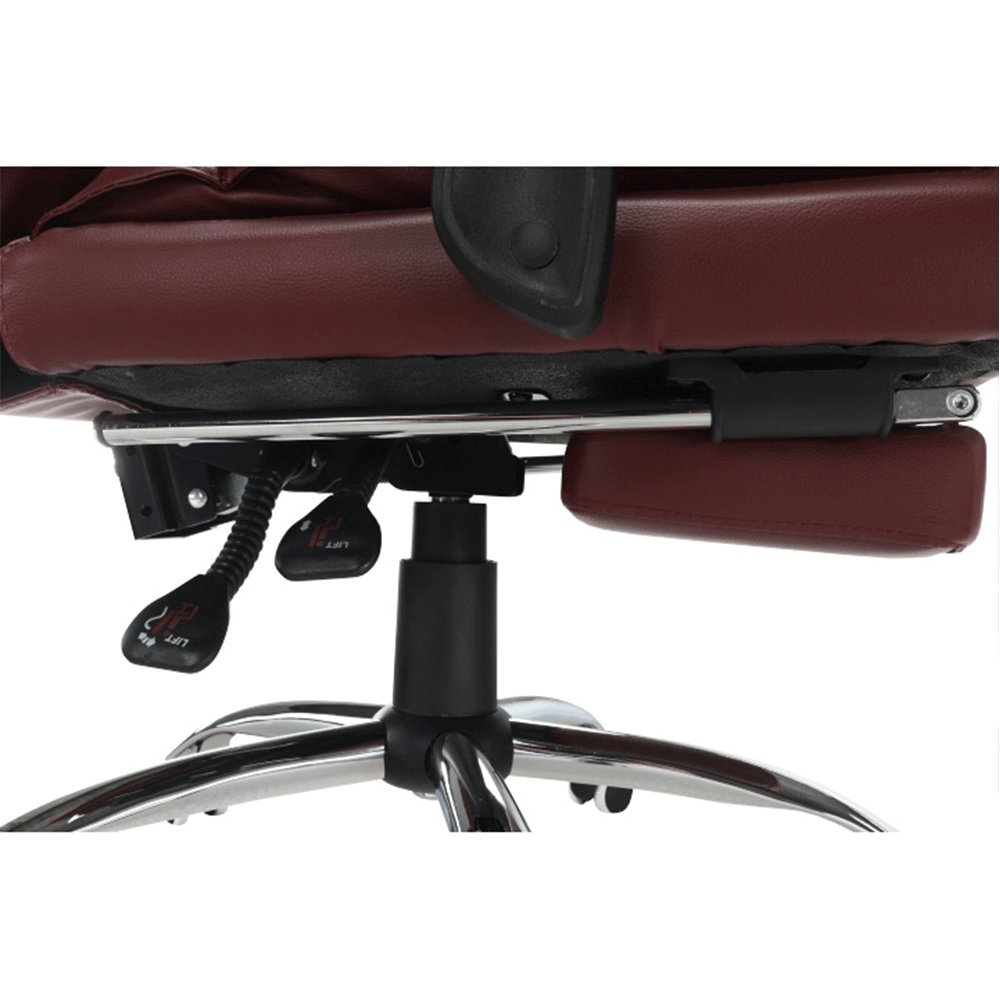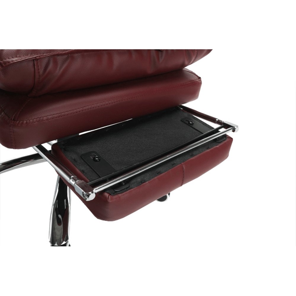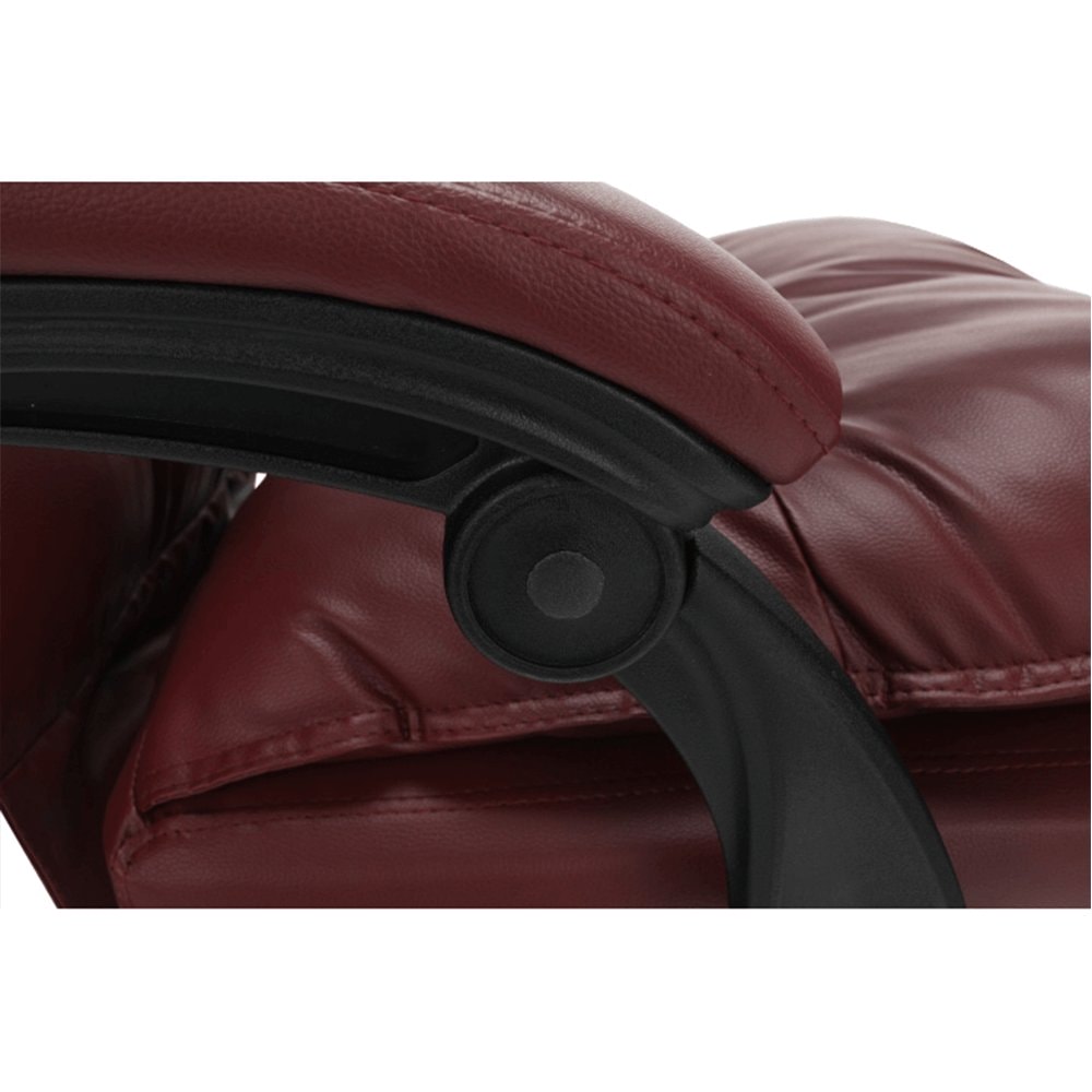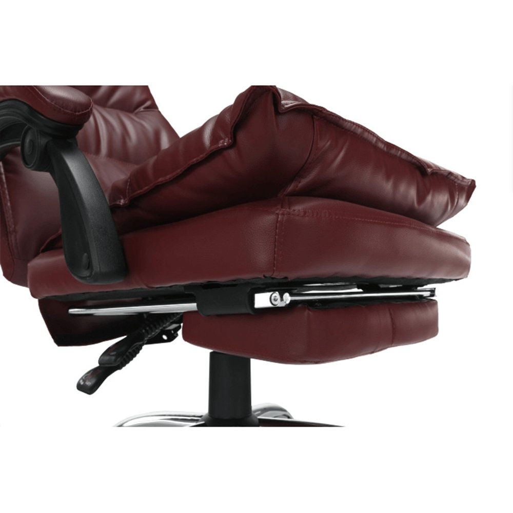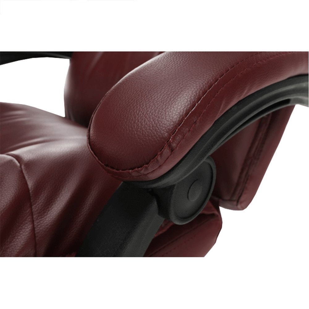 Křeslo DRAke je čalouněno ekokůží v bordó barvě. Opěradlo i sedátko jsou vybaveny ergonomicky tvarovanými polštáři, které násobí pohodlí při práci. Výšku sedu si umíte regulovat pomocí jednoduchého mechanismu umístěného pod sedadlem. Extra bonus jsou čalouněné opěrky na ruce. Potřebujete pauzu? Skloňte opěradlo do relaxační polohy, vysuňte podnož, vyložte si nohy a dopřejte si pár minut relaxu. Podnož stačí vysunout, abyste si zvýšili pocit z komfortu, který křeslo přináší. Pokud ji zrovna nepotřebujete, zasuňte ji pod sedadlo. Podnož nezabírá místo a nepřekáží, ale vždy je připravena posloužit vám. Univerzální kolečka jsou vhodná pro měkké i tvrdé podlahy. DRAKE, to je týpek, který by měl stát po vašem boku.