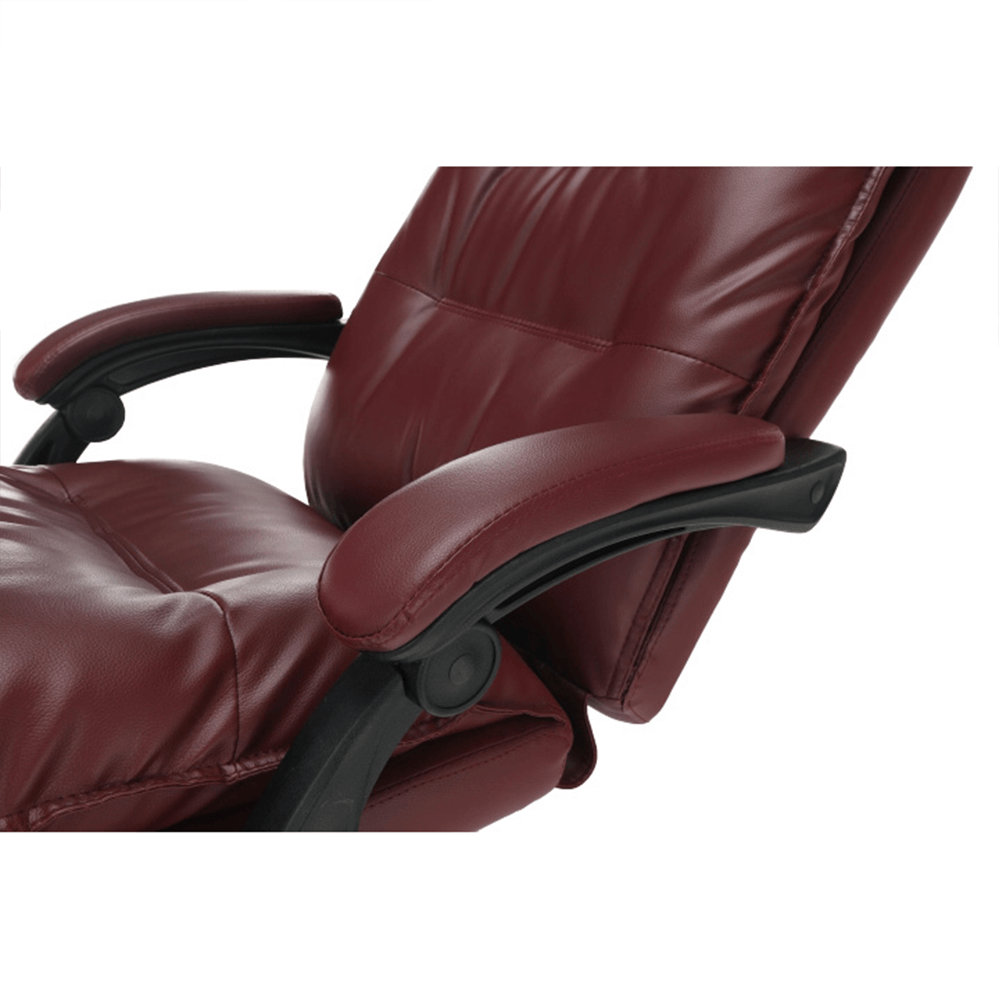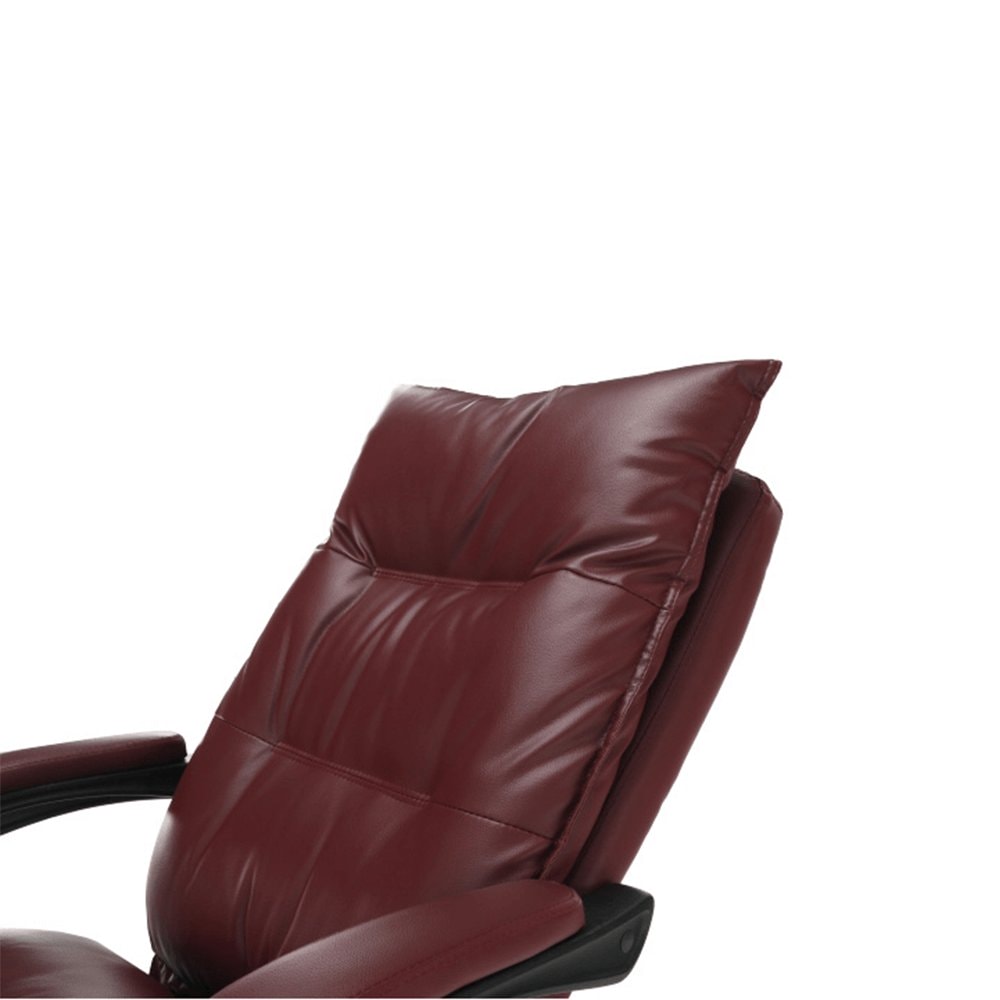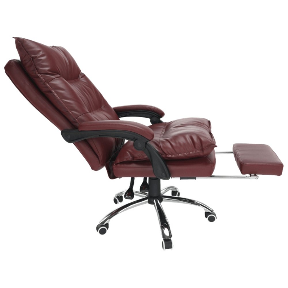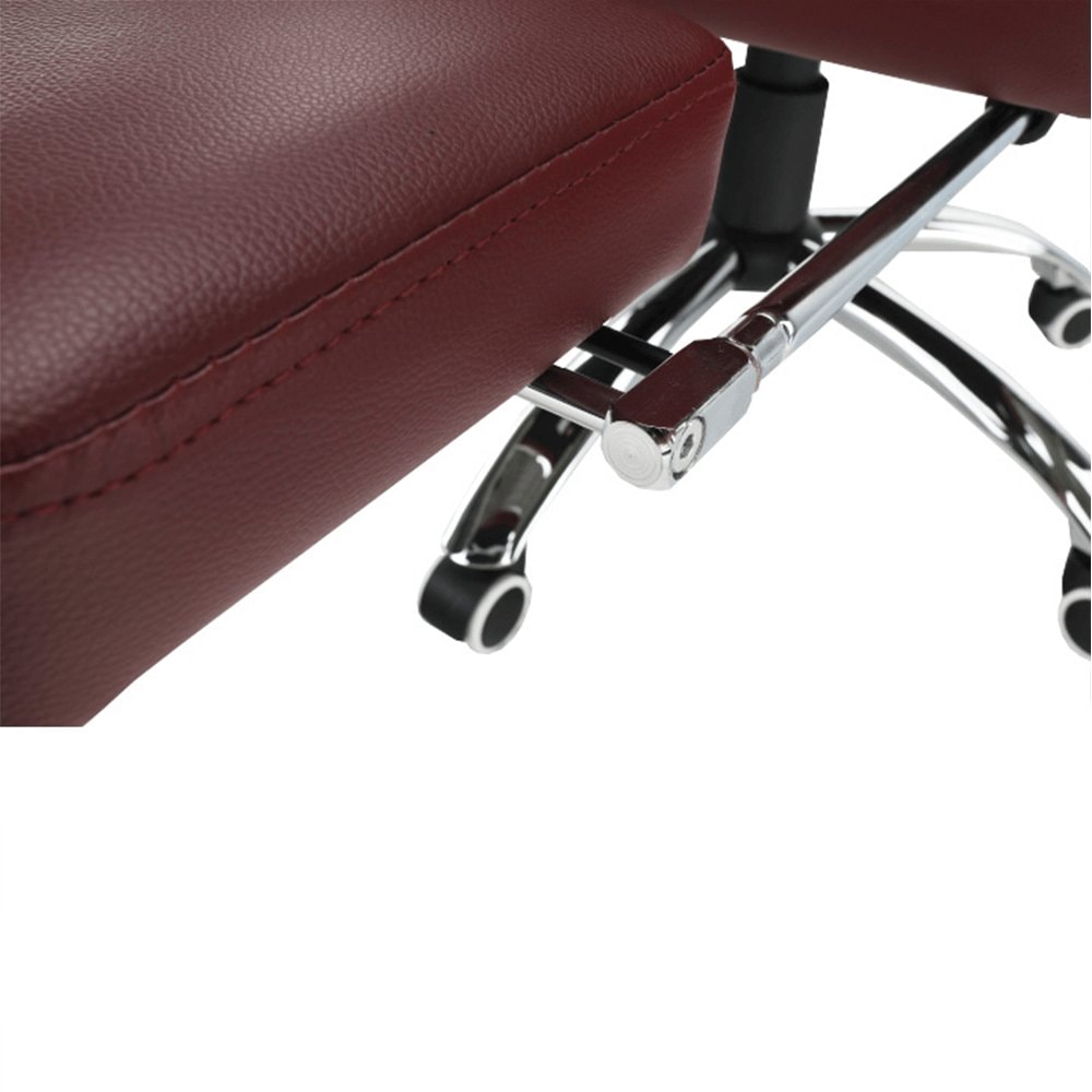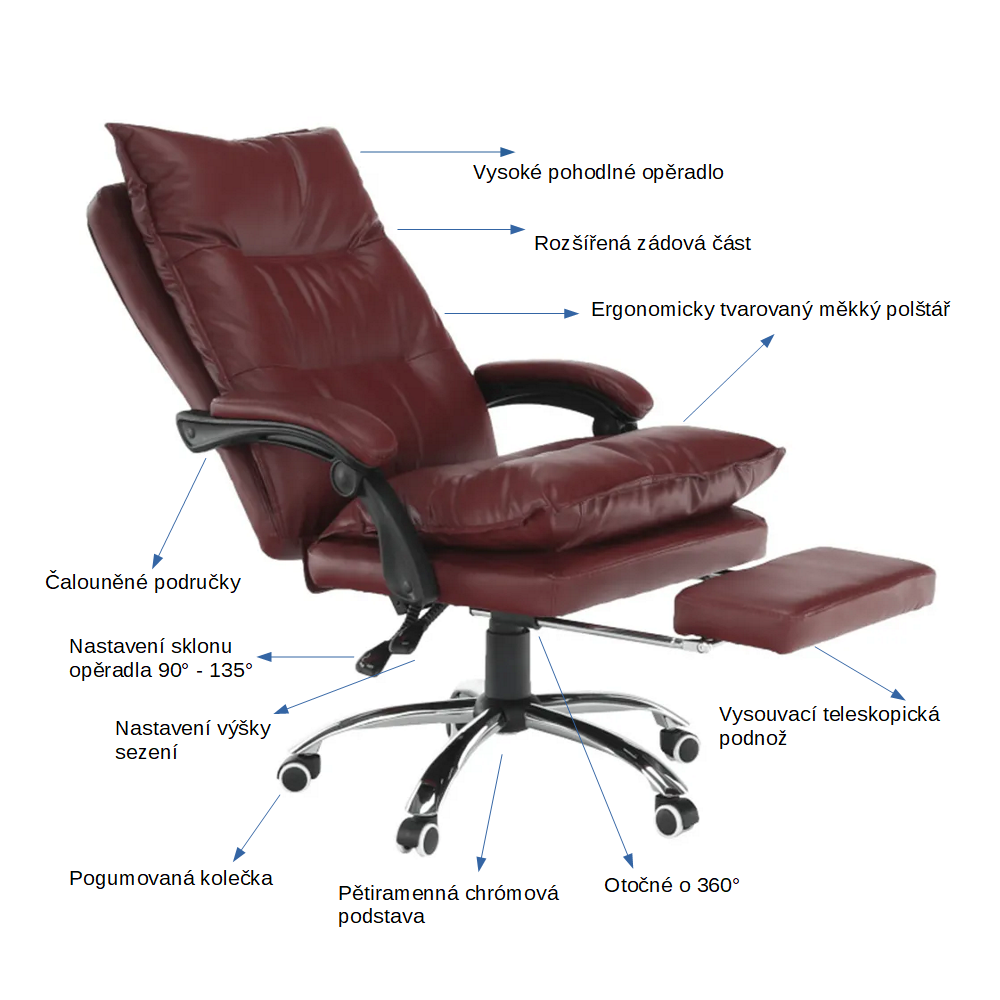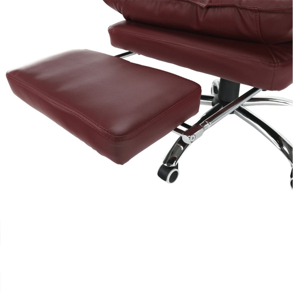 Křeslo DRAke je čalouněno ekokůží v bordó barvě. Opěradlo i sedátko jsou vybaveny ergonomicky tvarovanými polštáři, které násobí pohodlí při práci. Výšku sedu si umíte regulovat pomocí jednoduchého mechanismu umístěného pod sedadlem. Extra bonus jsou čalouněné opěrky na ruce. Potřebujete pauzu? Skloňte opěradlo do relaxační polohy, vysuňte podnož, vyložte si nohy a dopřejte si pár minut relaxu. Podnož stačí vysunout, abyste si zvýšili pocit z komfortu, který křeslo přináší. Pokud ji zrovna nepotřebujete, zasuňte ji pod sedadlo. Podnož nezabírá místo a nepřekáží, ale vždy je připravena posloužit vám. Univerzální kolečka jsou vhodná pro měkké i tvrdé podlahy. DRAKE, to je týpek, který by měl stát po vašem boku.