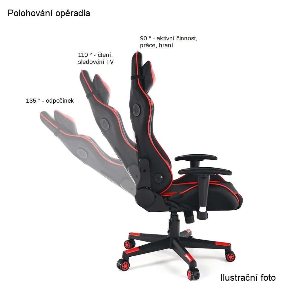 Nastavení sklonu opěradla 90° - 135°S ergonomickými polštáři na opěradle a sedadle