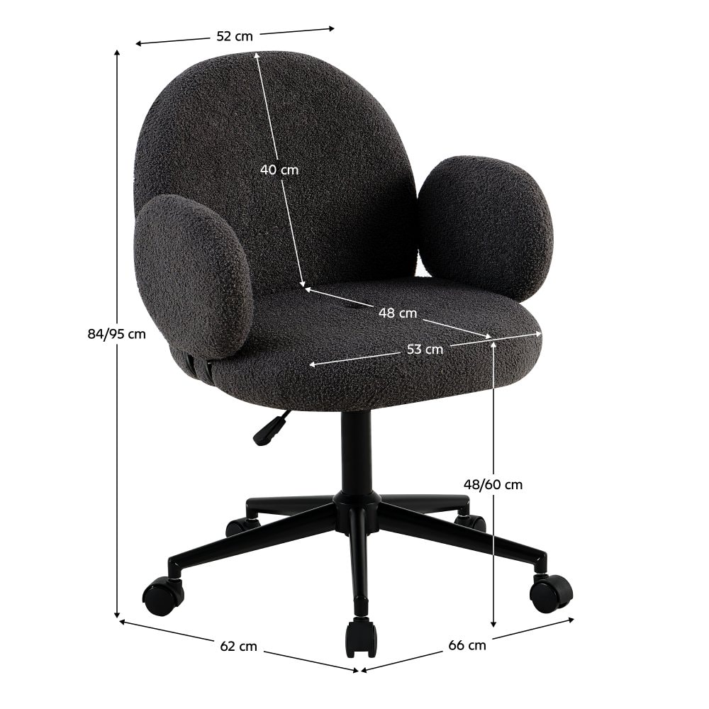 724 / 5 000 Materiál: látka Bouclé/kov Barva čalounění: šedá/černá Oděruodolnost textilie Velvet: 45 000 oděrů Rozměry (ŠxHxV): 64,5x65x83-92 cm Výška sedu: 47-56 cm Hloubka sedu: 48 cm Šířka sedu: 53 cm Šířka zad: 53 cm Výška zad: 40 cm Na kolečkách Opěrky na ruce Otočné Možnost nastavit výšku…