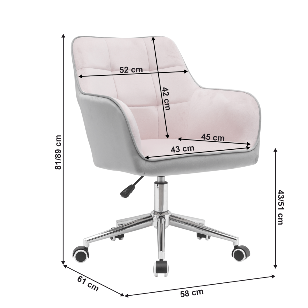 Materiál: Velvet látka/kov Oděruodolnost textilie podle testu Martindale: 85 000 oděrů Barva: růžová/šedá/chrom Rozměry (ŠxHxV): 58x61x81-89 cm Nastavení výšky křesla Nastavitelná výška sedu: 43-51 cm Hloubka sedu: 45 cm Šířka sedu: 43 cm Šířka zádové opěrky: 52 cm Výška zádové opěrky: 42 cm…
