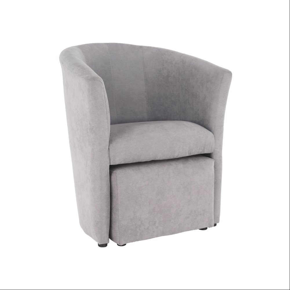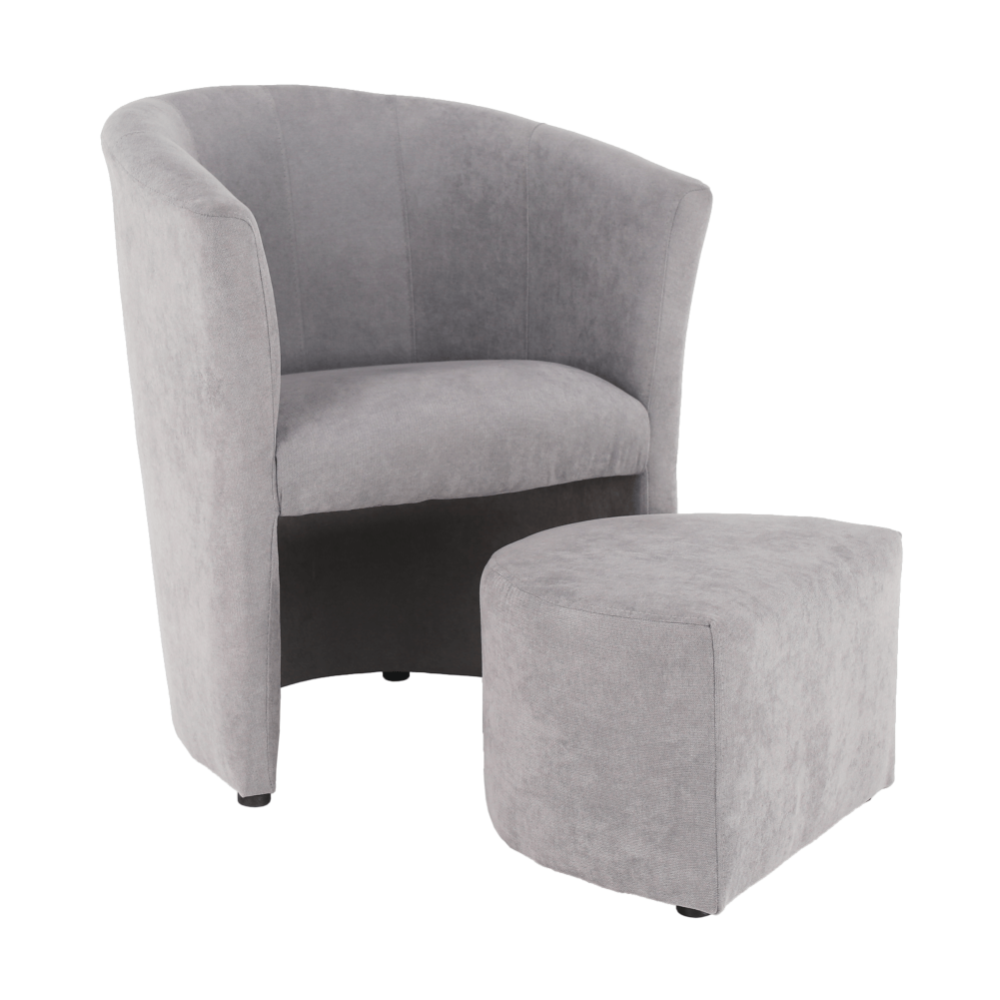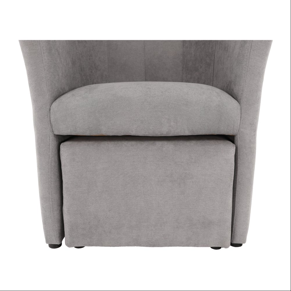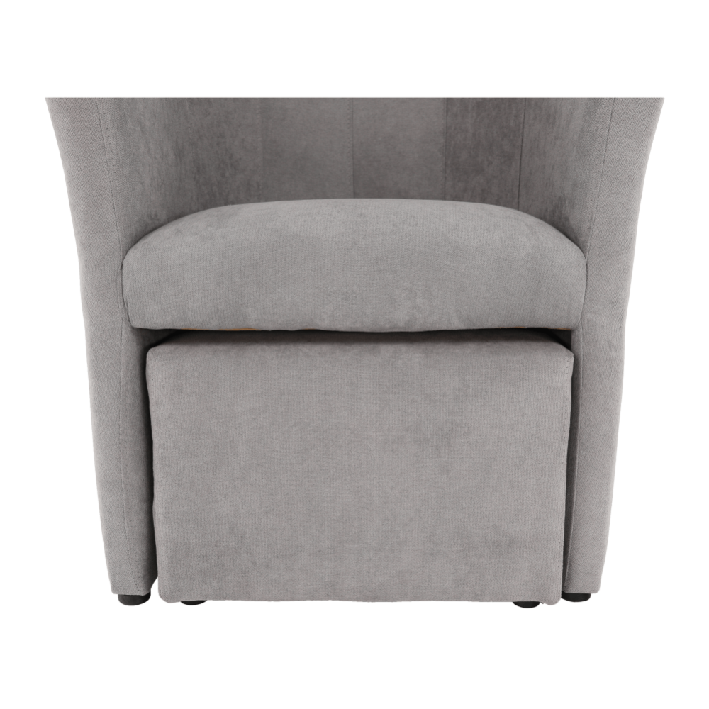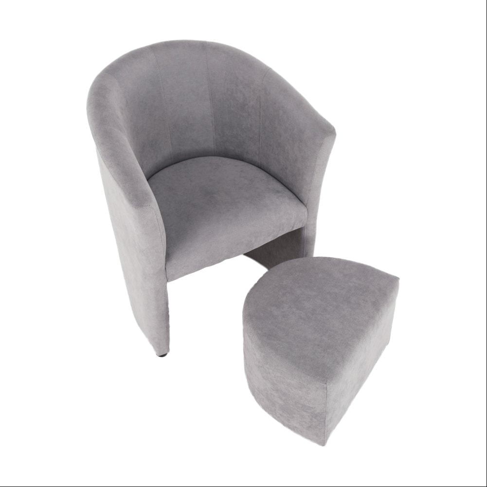 Křeslo i taburet je celočalouněné látkou v šedé barvě.