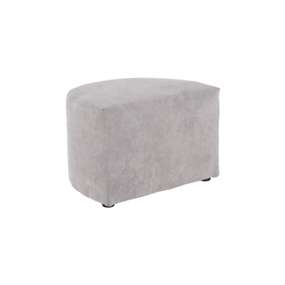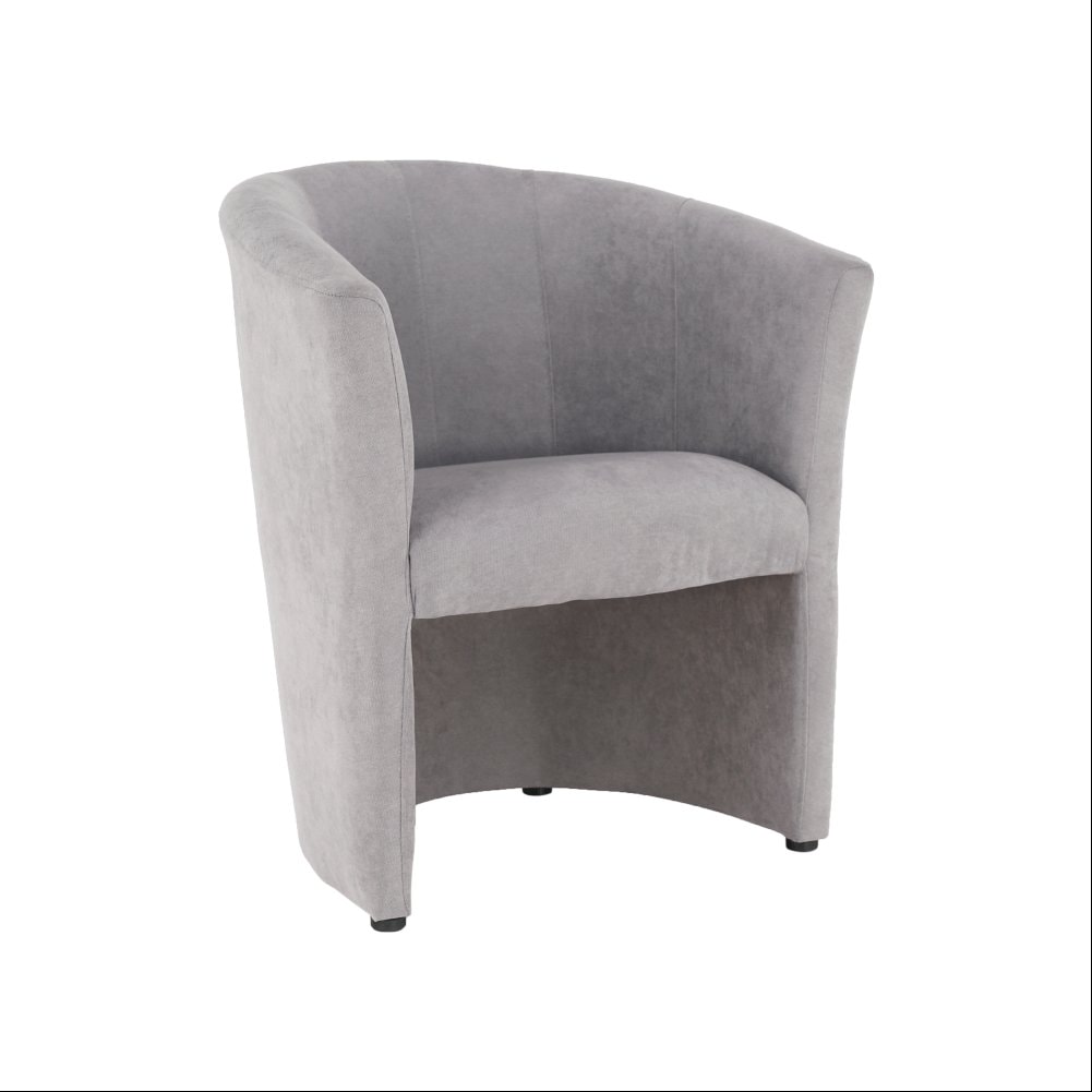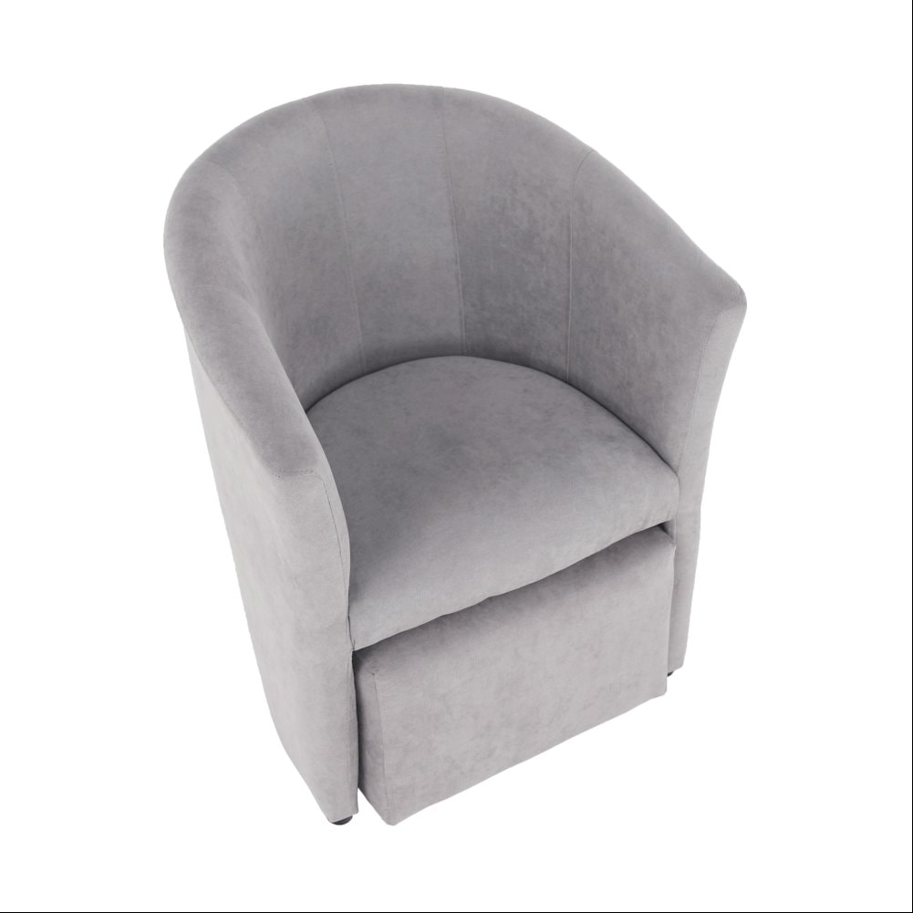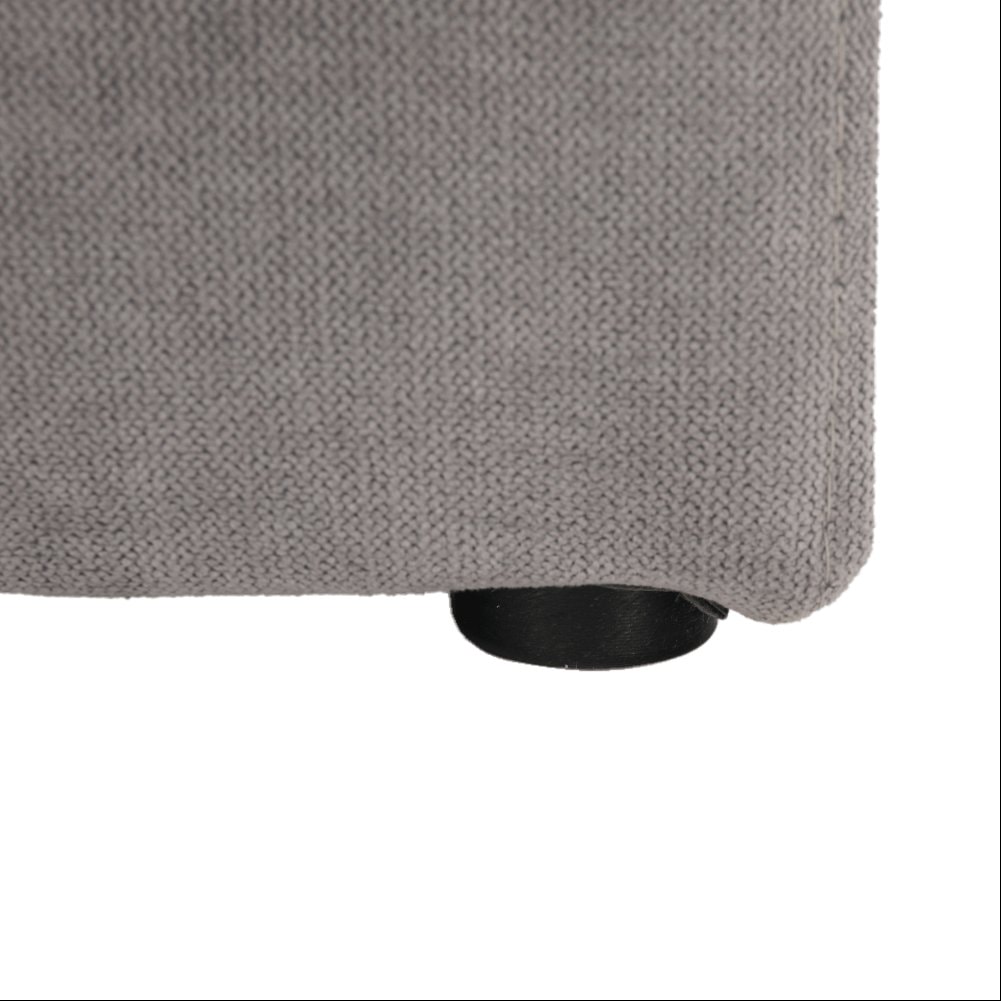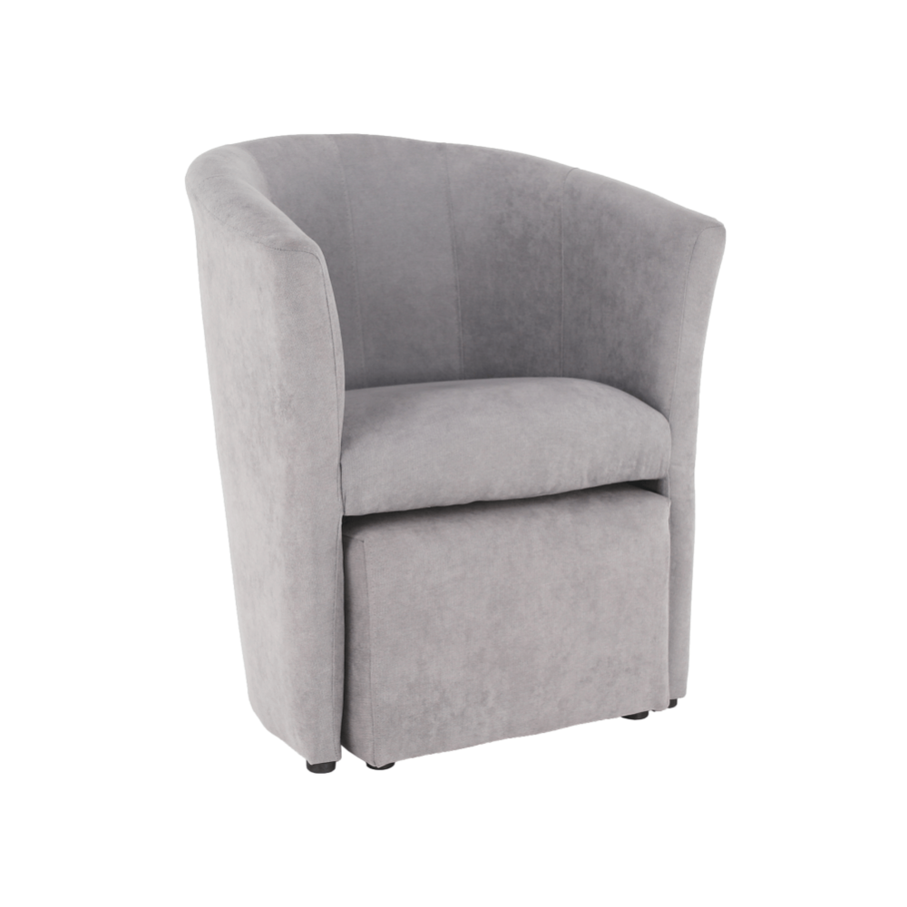 Křeslo i taburet je celočalouněné látkou v šedé barvě.
