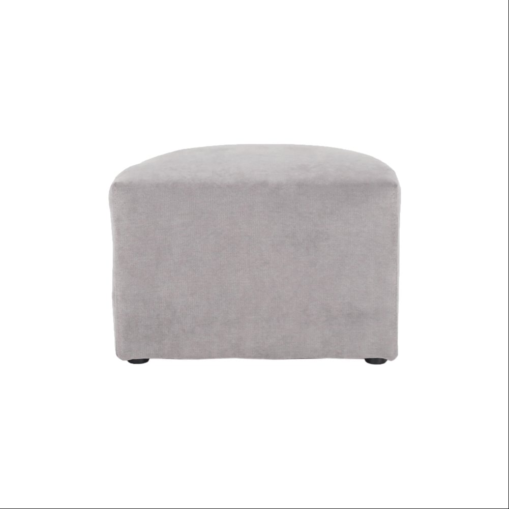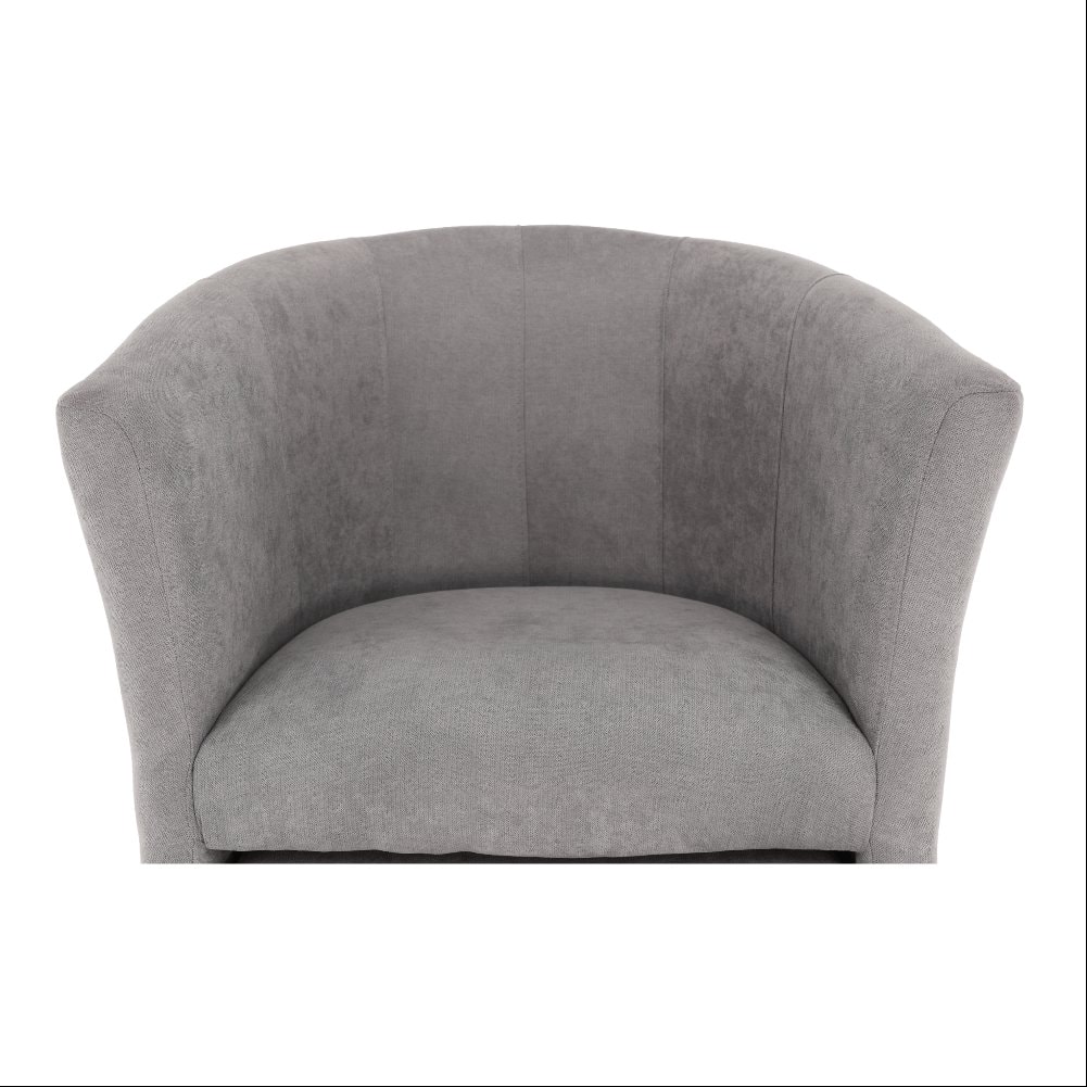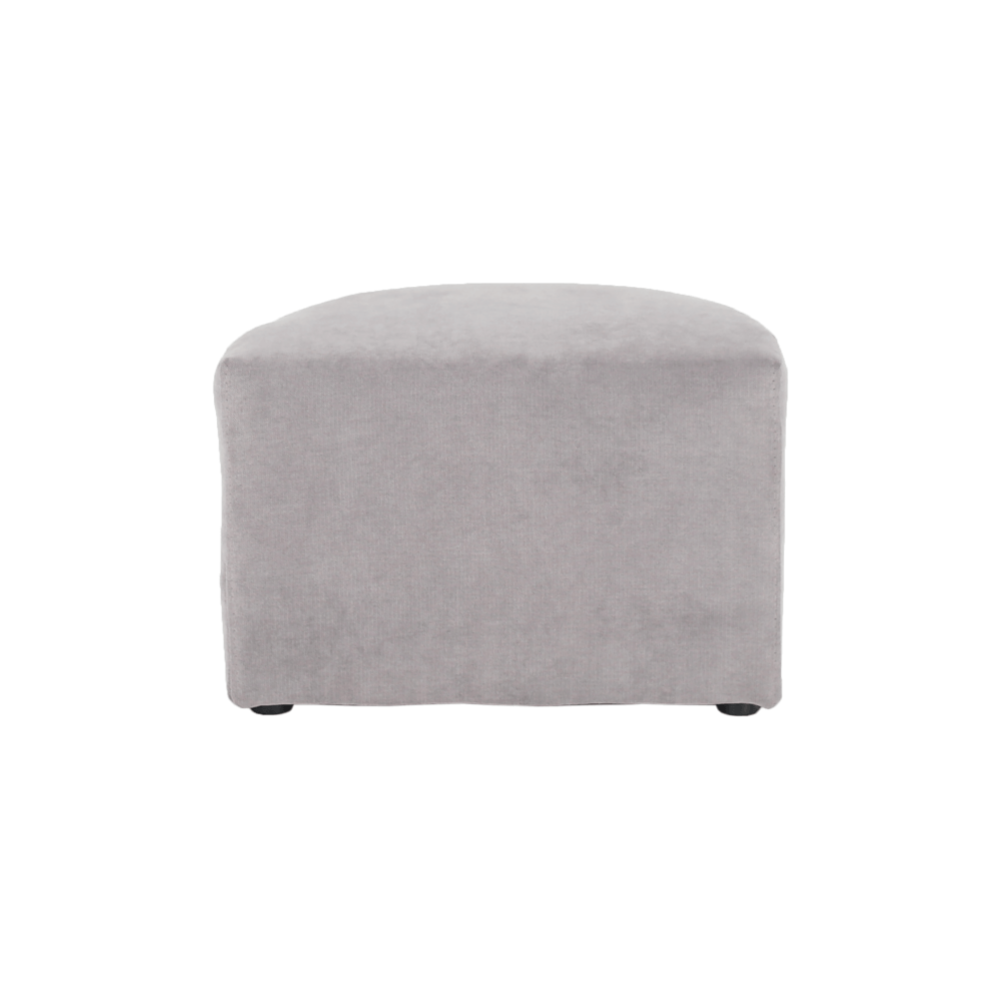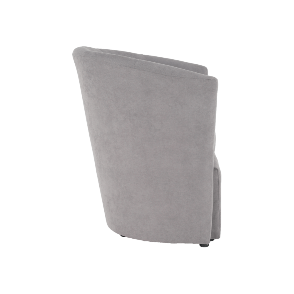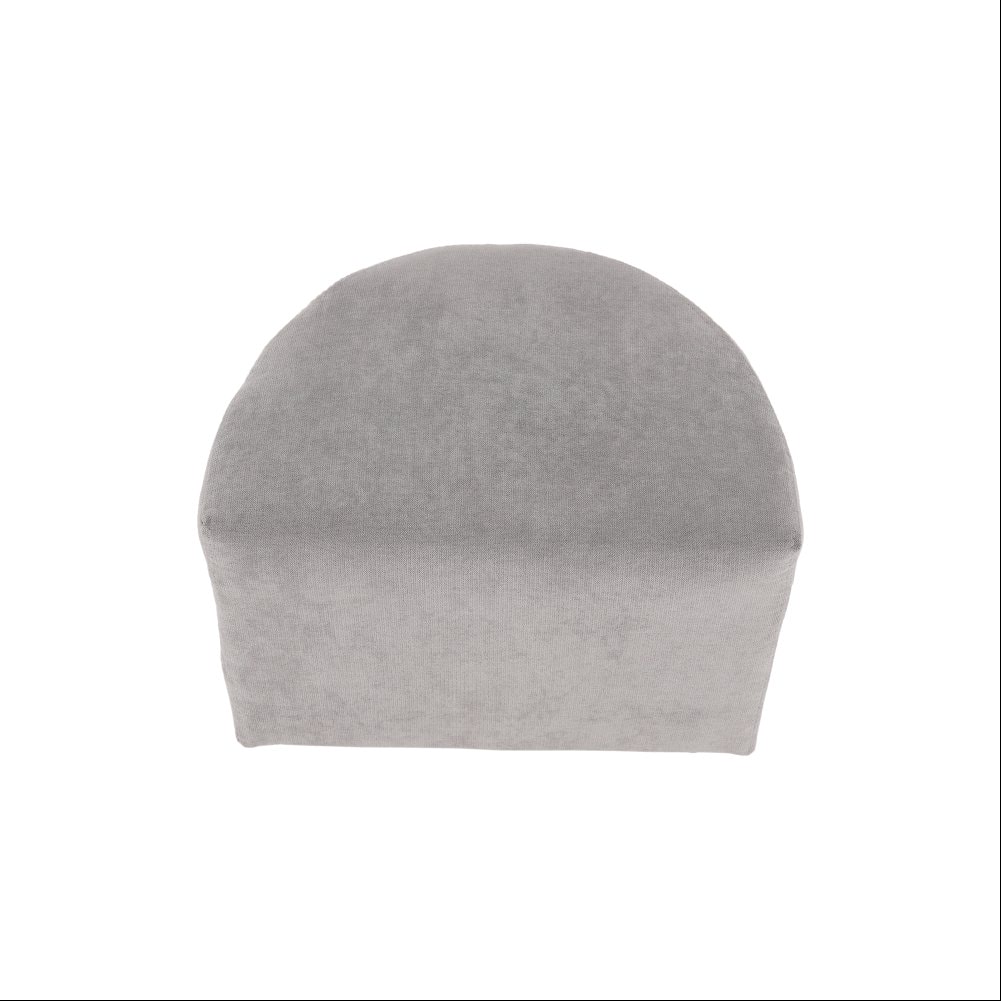 Křeslo i taburet je celočalouněné látkou v šedé barvě.