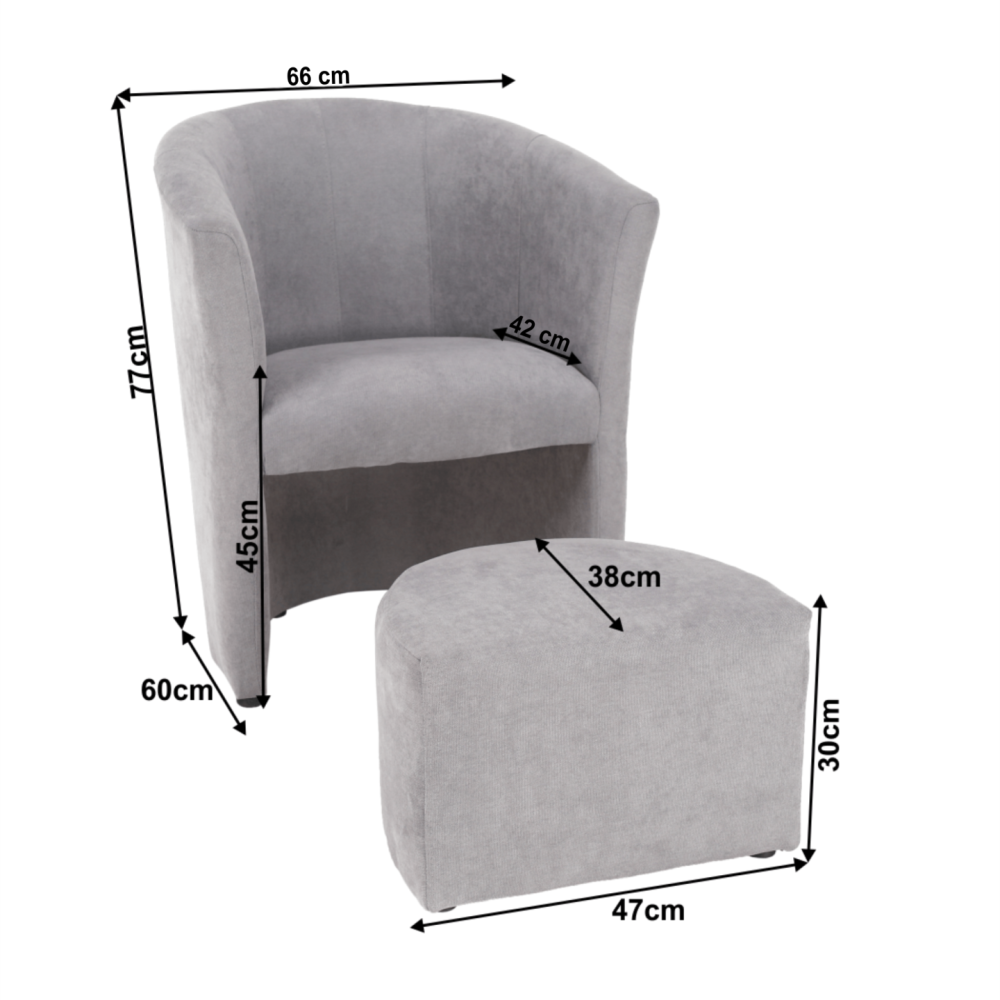 Křeslo s taburetem ROSE Materiál: látka Soro Oděruodolnost textilie podle testu Martindale: 90 000 - 100 000 oděrů Barva: 90 šedá Rozměry křeslo (ŠxVxH): 66x77x60 cm Výška sedu: 45 cm Hloubka sedu: 42 cm Rozměry taburet (ŠxHxV): 47x38x30 cm Hmotnost: 17 kg Nosnost: 120 kg Taburet jako…
