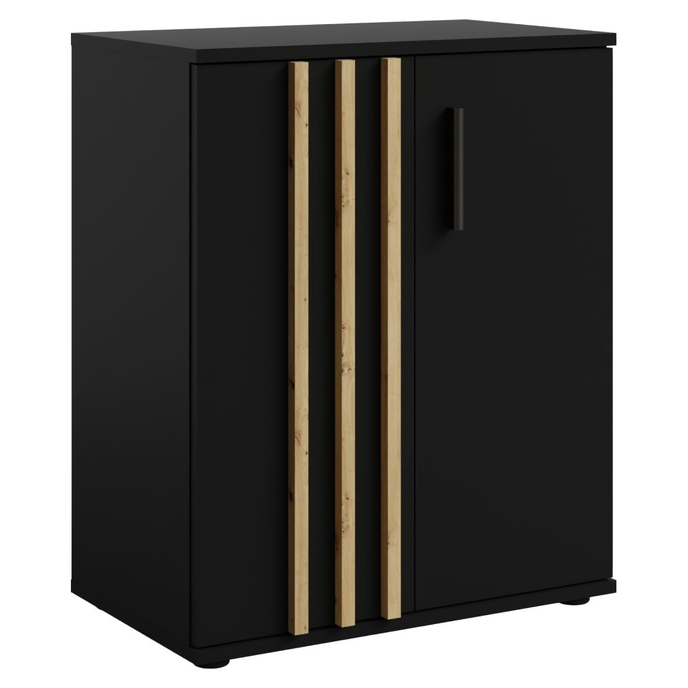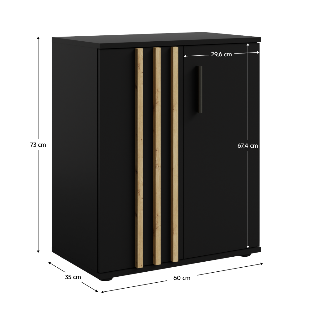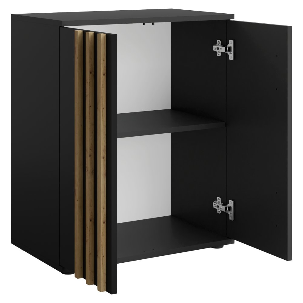 Vyrobená z laminované DTD a MDF v barevné kombinaci černá a dub artisan. Je dvoudveřová s jednou policí, ideální pro ukládání menších předmětů či dekorací. Manipulace s dveřmi je zajištěna pomocí černého úchytu. Úchytka se nachází jen z jedné strany dveří. Dvířka jsou doplněna o ozdobné lamely, které jim dodávají luxusní vzhled. Komoda je skvělou volbou do menších prostor, kde poskytuje praktický úložný prostor bez zbytečného zabírání místa.