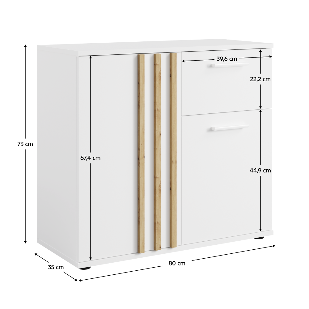 Vyrobená z laminované DTD a MDF v barevné kombinaci bílá a dub artisan. Je dvoudveřová s jednou policí a jedním šuplíkem, ideální pro ukládání menších předmětů či dekorací. Manipulace s dveřmi je zajištěna pomocí bílého úchytu. Úchytka se nachází jen z jedné strany dveří. Dvířka jsou doplněna o ozdobné lamely, které jim dodávají luxusní vzhled. Komoda je skvělou volbou do menších prostor, kde poskytuje praktický úložný prostor bez zbytečného zabírání místa.