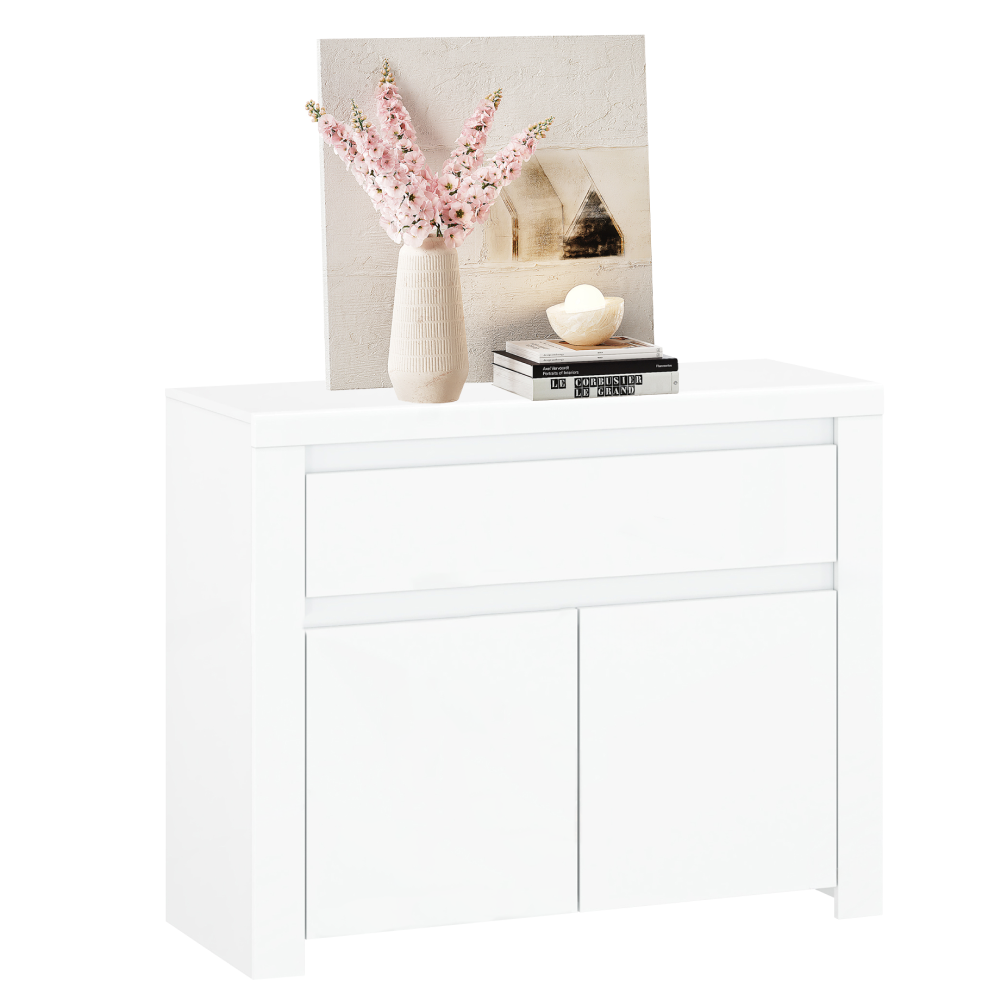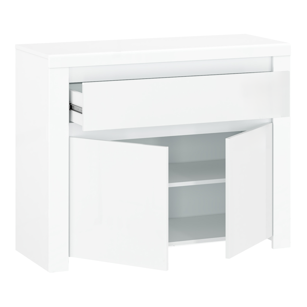 Materiál: laminovaná DTD / MDF / ABS hrany Barva: bílý lesk Rozměry (ŠxHxV): 106x41,5x84,5 cm Tloušťka materiálu: 1,6 cm Obsahuje jednu zásuvku a skříňku 1 police Dvířka bez úchytek Korpus z DTD Dvířka / fronty z MDF ABS hrany moderní design Dodávané v demontu