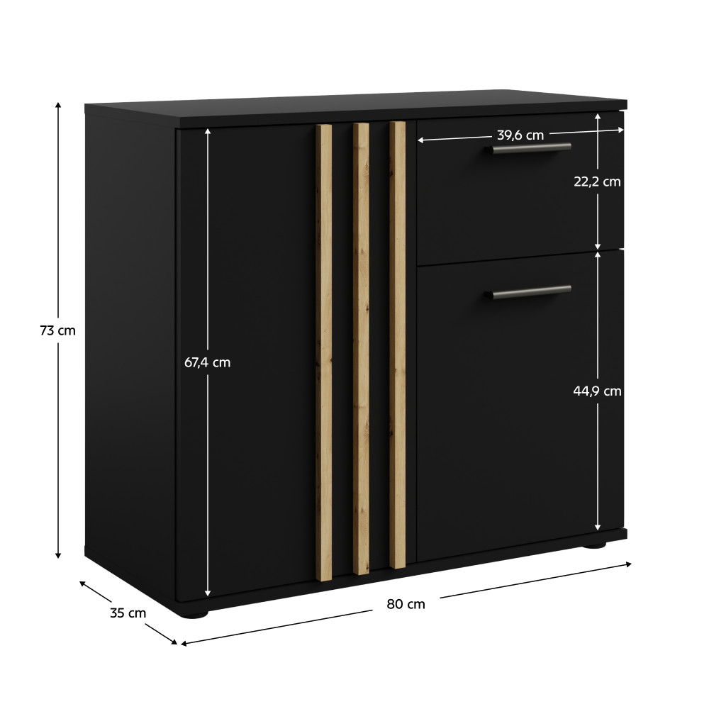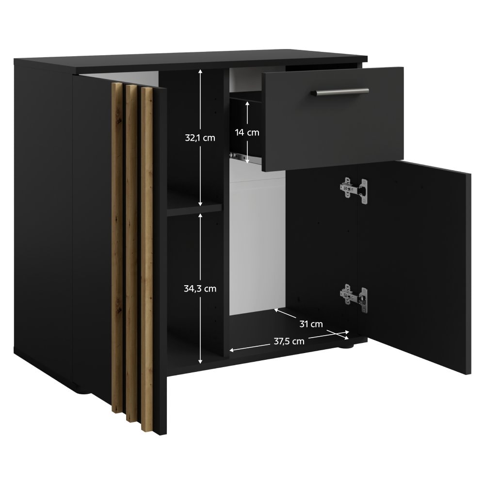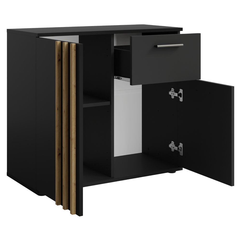 Vyrobená z laminované DTD a MDF v barevné kombinaci černá a dub artisan. Je dvoudveřová s jednou policí a jedním šuplíkem, ideální pro ukládání menších předmětů či dekorací. Manipulace s dveřmi je zajištěna pomocí černého úchytu. Úchytka se nachází jen z jedné strany dveří. Dvířka jsou doplněna o ozdobné lamely, které jim dodávají luxusní vzhled. Komoda je skvělou volbou do menších prostor, kde poskytuje praktický úložný prostor bez zbytečného zabírání místa.
