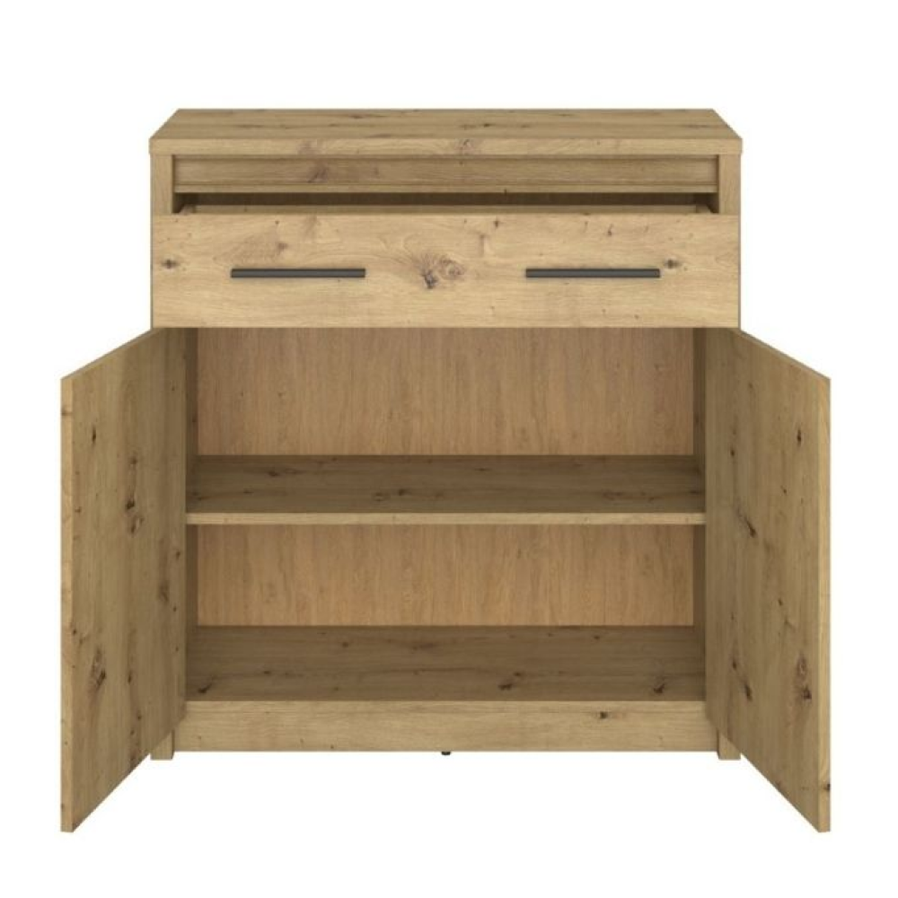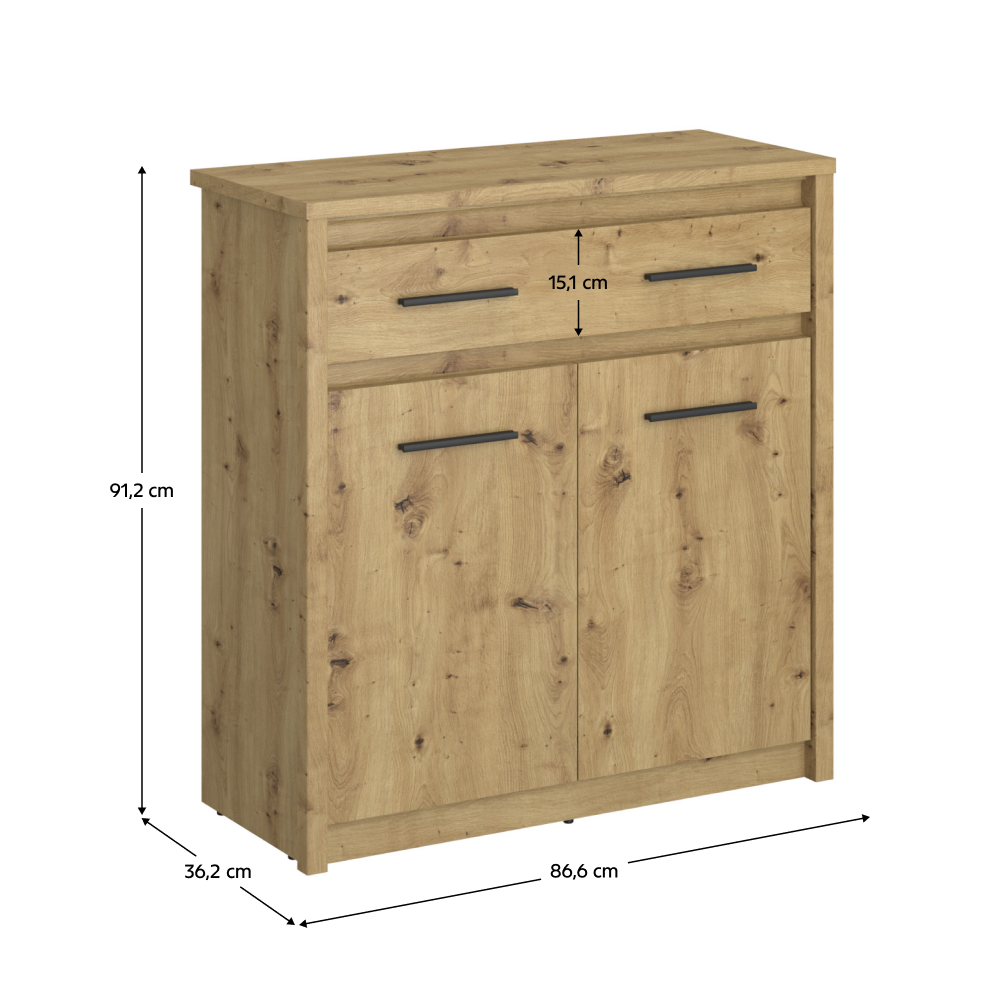 Materiál: DTD laminovaná/ABS hrany Barva: dub artisan Rozměry (ŠxHxV): 86,6x36,2x91,2 cm Tloušťka materiálu: 1,6-3,2 cm Plastové úchytky Barva úchytek: černá Šuplík Výška šuplíku: 15,1 cm Police Nosnost police: 5 kg Dvoudveřová skříňka Plastové nožičky Moderní design Doporučujeme připevnit ke zdi…