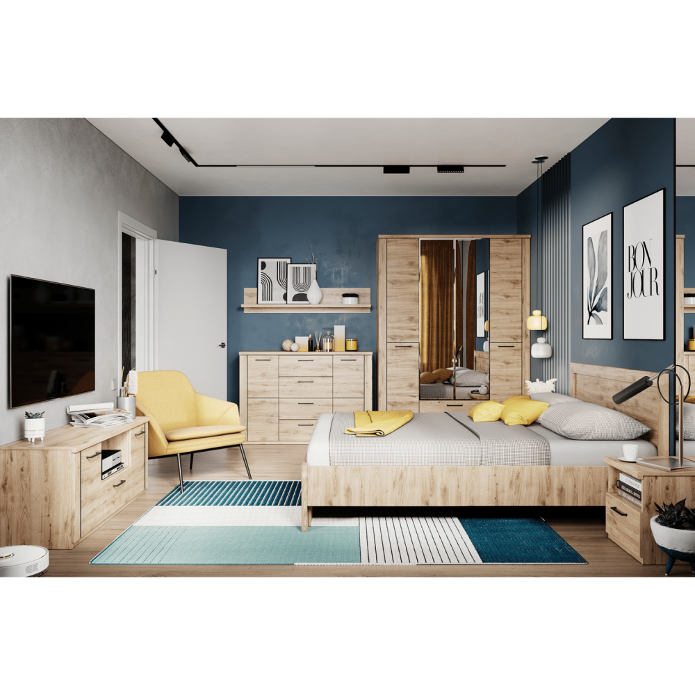 Sektorový nábytek z kolekce DORSI okouzlí nejednoho návštěvníka vaší domácnosti. Přichází se spoustou komponentu, se kterými zařídíte nejen obývací pokoj, ale vkusně dotvoříte prostor ve vaší jídelně, ložnici, studentském pokoji, kanceláři nebo předsíni. DORSI je vyroben z laminované dřevotřísky, korpus je MDF. Originální je barevným provedením dub navarra, který mu přidává na eleganci. Při manipulaci s nábytkem vám pomohou praktické černé plastové úchytky.