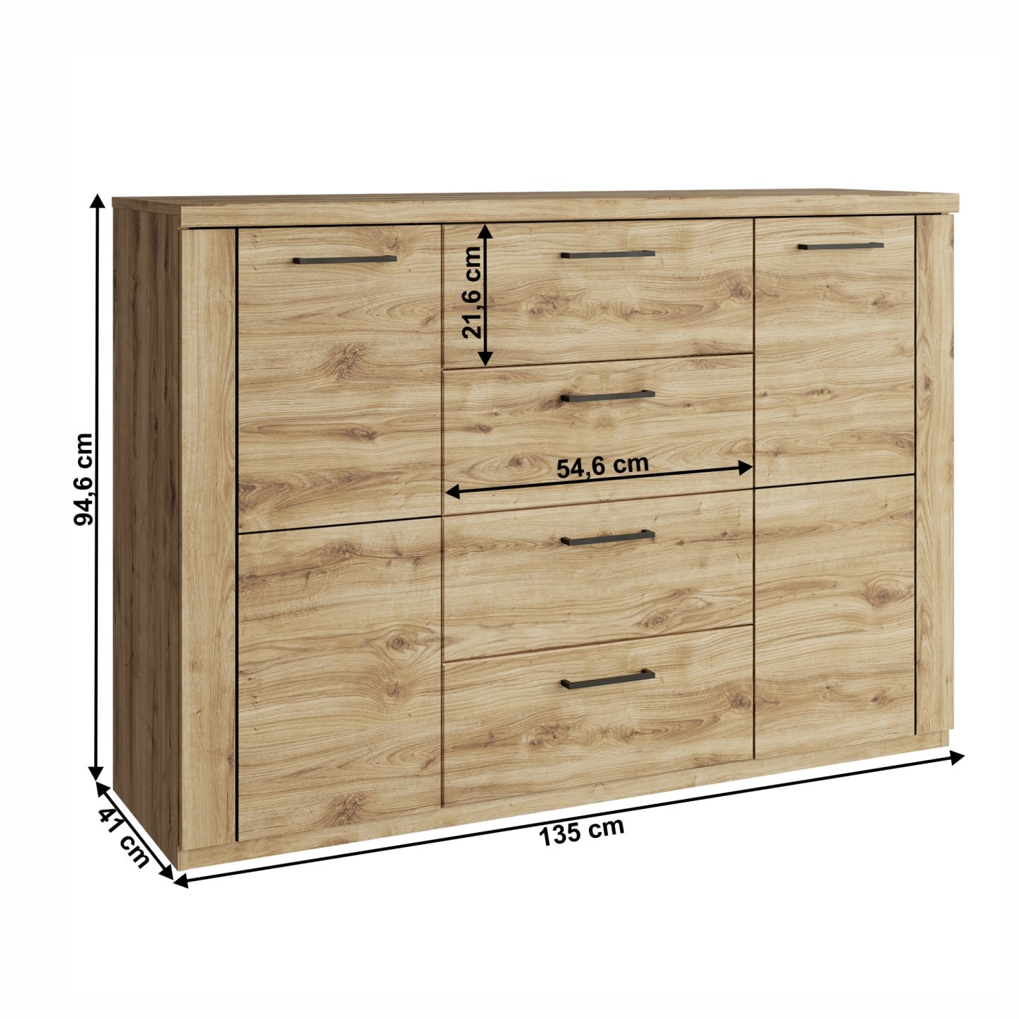 Komoda DORSI 2D4S Materiál: DTD laminovaná/MDF Barva: dub navarra Rozměry (ŠxHxV): 135x41x 94,6 cm Tloušťka materiálu: 1,6 cm Dvoudveřová Policová Čtyři šuplíky Rozměr šuplíku (ŠxV): 54,6x21,6 cm Plastové úchytky Barva úchytek: černá Moderní design Dodáváno v demontu