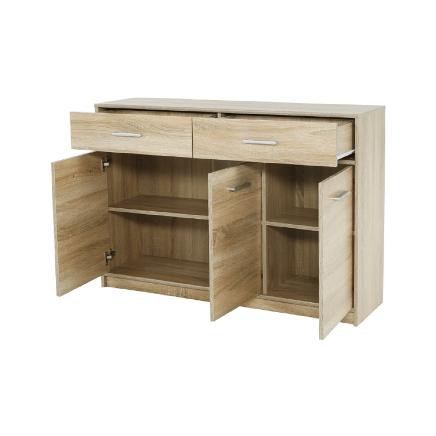 Komoda 3D2S TEYO Materiál: DTD laminovaná Barevné provedení: dub sonoma Rozměry (ŠxHxV): 123,2x34,3x85,5 cm Tloušťka materiálu: 16 mm Dodávána v demontu.