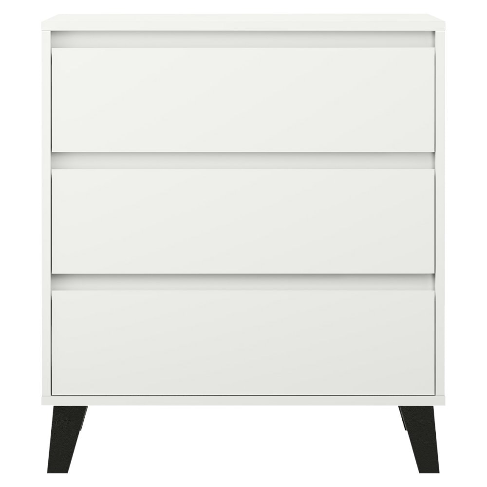 Materiál: laminovaná DTD Barva: bílá Rozměry (ŠxHxV): 70x38,8x78,4 cm Výška spodního prostoru od podlahy: 12 cm Tři šuplíky Rozměr šuplíku (ŠxV): 66,2x18 cm Vnitřní rozměr šuplíku (ŠxHxV): 60,8x33,3x9 cm Na nožičkách Barva nožiček: černá Nosnost šuplíku: 5 kg Nosnost vrchní desky: 15 kg Moderní…