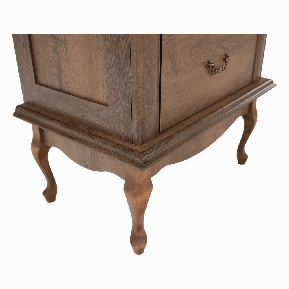Materiál: DTD laminovaná / ABS hrany Barva: dub lefkas Rozměry (ŠxHxV): 75x47x125 cm Výška spodního prostoru od podlahy: 25 cm Tloušťka materiálu: 30 mm Pět šuplíků 3D efekt kovové úchytky Dřevěné nožičky ABS hrany barokní styl