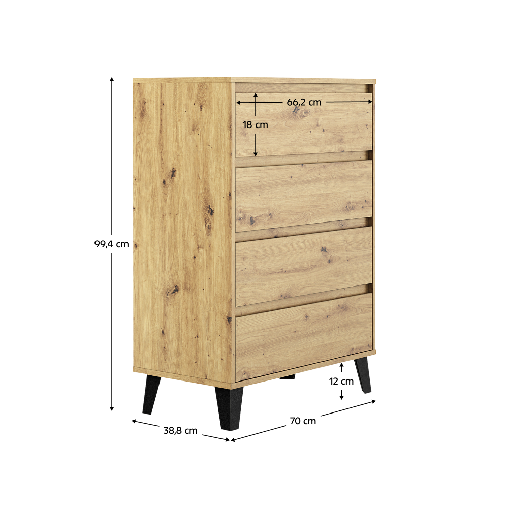 Materiál: laminovaná DTD Barva: dub artisan Rozměry (ŠxHxV): 70x38,8x99,4 cm Výška spodního prostoru od podlahy: 12 cm Čtyři šuplíky Rozměr šuplíku (ŠxV): 66,2x18 cm Vnitřní rozměr šuplíku (ŠxHxV): 60,8x33,3x9 cm Na nožičkách Barva nožiček: černá Nosnost šuplíku: 5 kg Nosnost vrchní desky: 15 kg…
