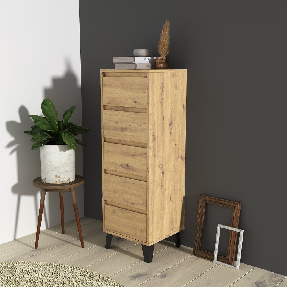 Vyrobena v nadčasovém designu z laminované dřevotřísky provedení dub artisan barevném provedení. KomodaBOGAN NEW 5S40nabízí úložný prostor v podobě pěti šuplíků,které s lehkostí otevřete pomocí jednoduchých zafrézovaných žlábků ve dvířkách.