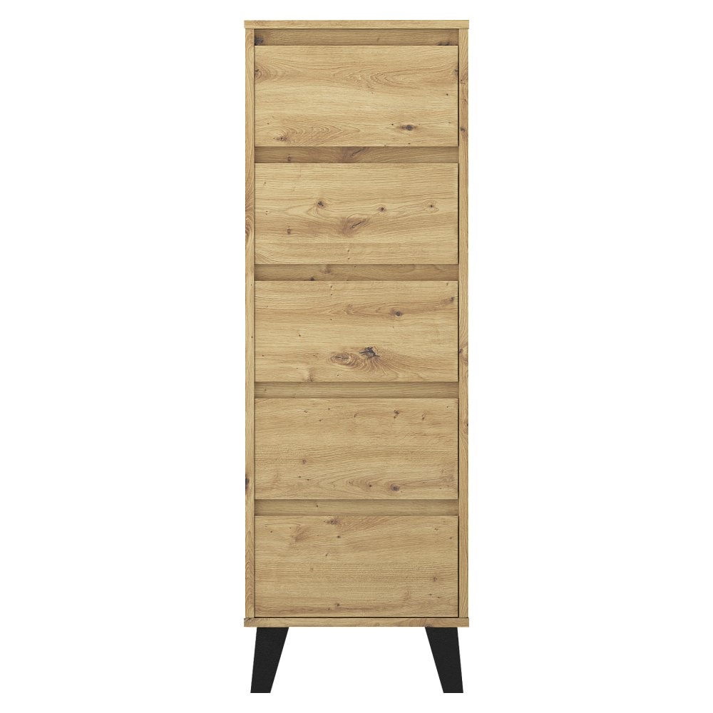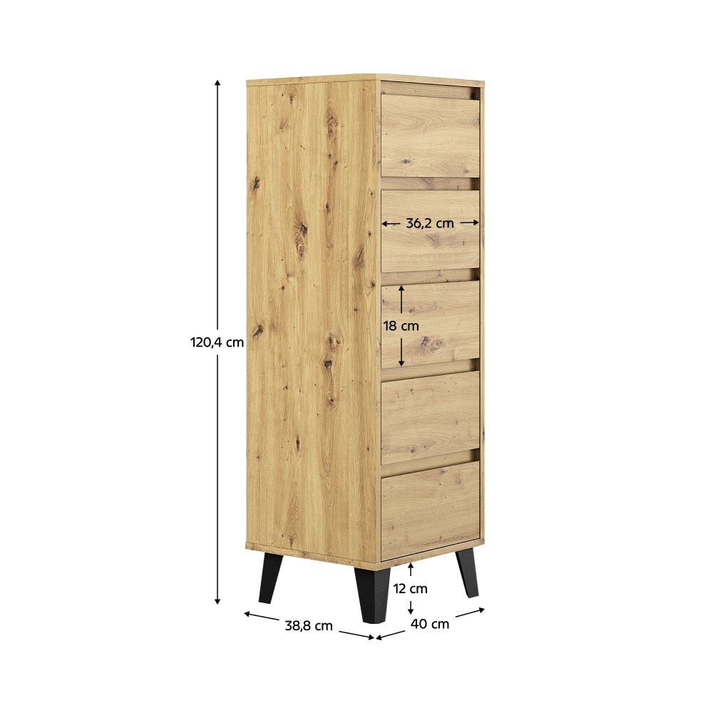 Materiál: laminovaná DTD Barva: dub artisan Rozměry (ŠxHxV): 40x38,8x120,4 cm Výška spodního prostoru od podlahy: 12 cm Pět šuplíků Rozměr šuplíku (ŠxV): 36,2x18 cm Vnitřní rozměr šuplíku (ŠxHxV): 30,8x33,3x9 cm Na nožičkách Barva nožiček: černá Nosnost šuplíku: 5 kg Nosnost vrchní desky: 15 kg…