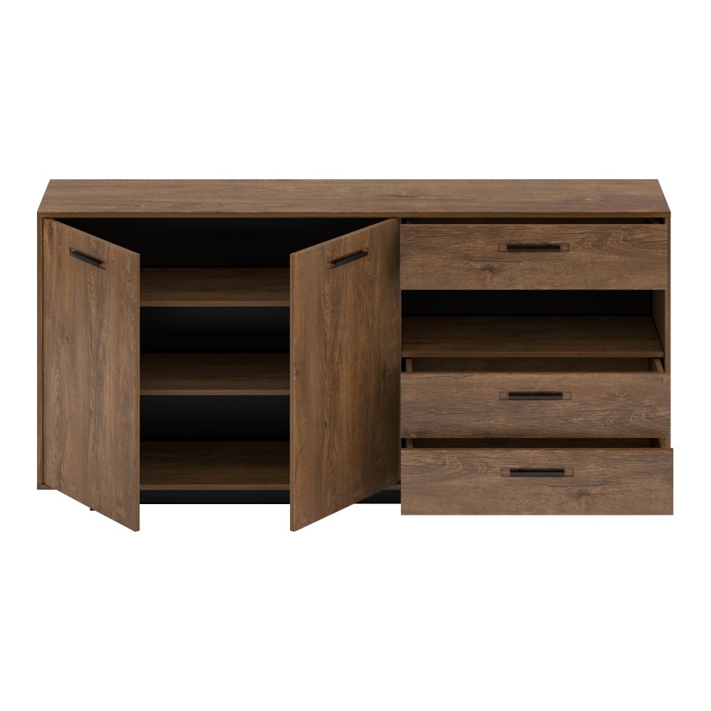 Materiál: DTD laminovaná / MDF Barva: dub bolzano / černá Rozměry (ŠxHxV): 179,7x40x86,2 cm Tloušťka materiálu: 16 mm 1 dvoudveřová skříňka s policemi 3 zásuvky Otevřený úložný prostor na podstavci Výška spodního prostoru od podlahy: 5 cm kovové úchytky originální design Krásná kresba dřeva Do tradičního i moderního interiéru Do obývacího pokoje, pracovny i studentského pokoje Dodávána v demontu