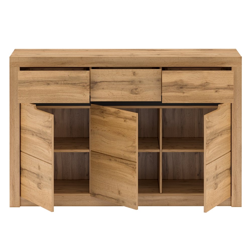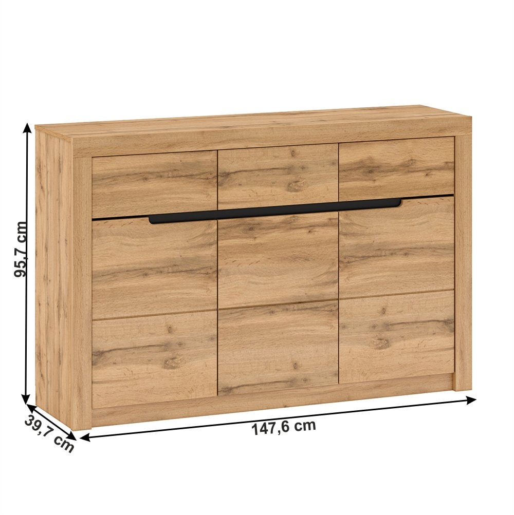 Materiál: DTD laminovaná / MDF Barva: dub Wotan Rozměry (ŠxHxV): 147,6x39,7x95,7 cm Tloušťka materiálu korpus: 16 mm Tloušťka materiálu dvířka: 19 mm třídveřová S policemi tři šuplíky Dodávané v demontu