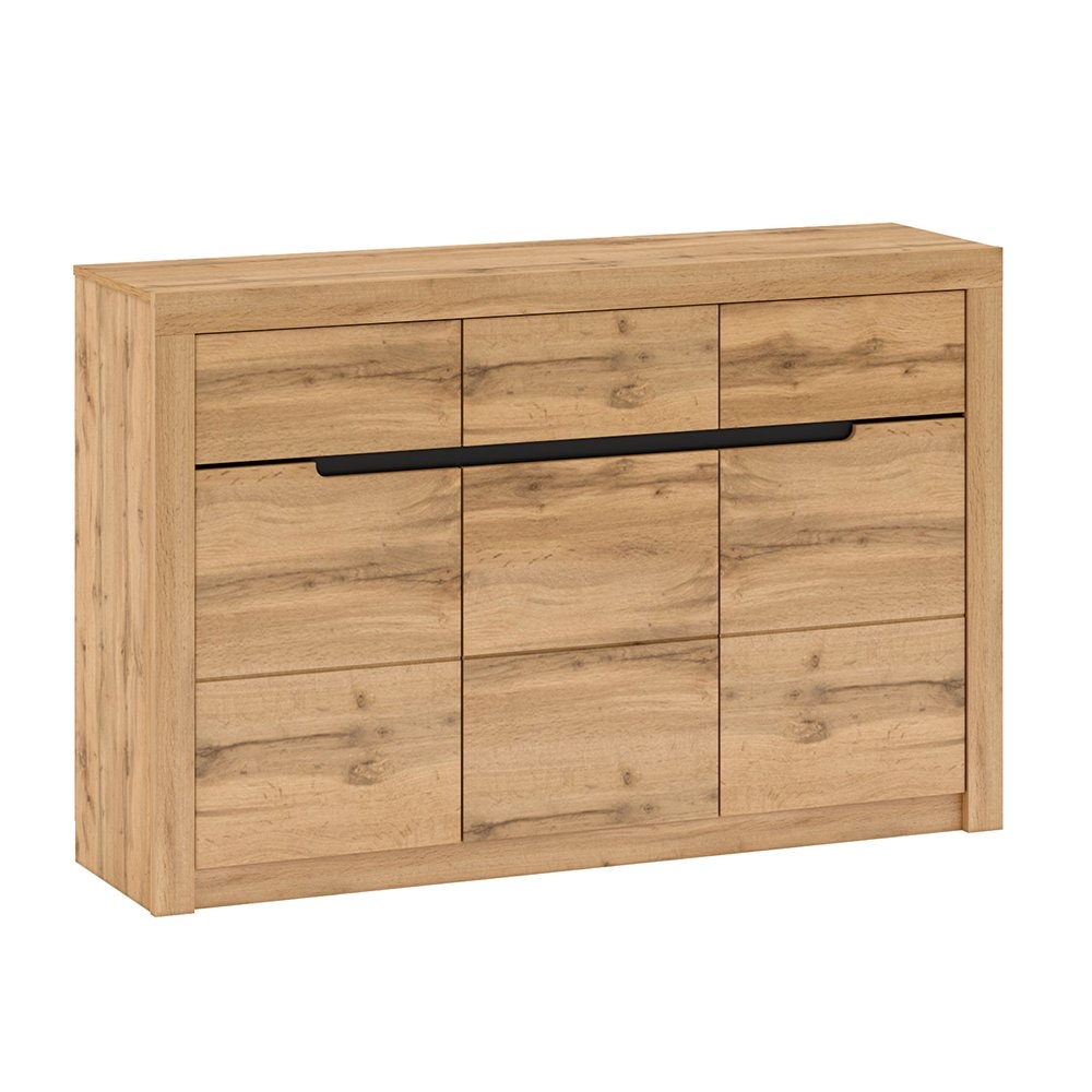 Komoda TORONTA E se u vás určitě zabydlí. Nabízí úložný prostor v podobě tří skříněk a tří šuplíků. Všechny vaše věci získají jedinečný a stylový domov.