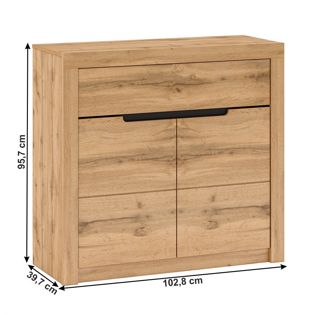 Materiál: DTD laminovaná / MDF Barva: dub Wotan Rozměry (ŠxHxV): 102,8x39,7x95,7 cm Tloušťka materiálu korpus: 16 mm Tloušťka materiálu dvířka: 19 mm dvoudveřová jeden šuplík Dodávané v demontu